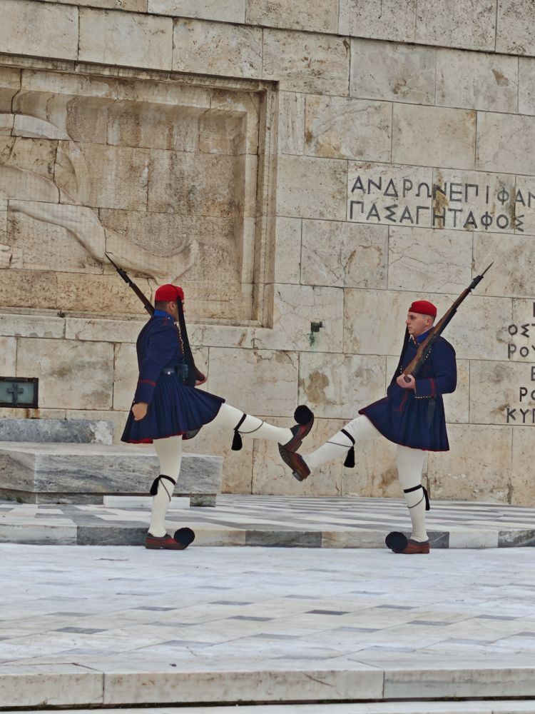 除了雅典卫城以外,我想宪法广场应该是去雅典的游客一定会去的地方,其实广场没有什么特别,跟其它地方的广场好像也差不多,但是他们的卫兵换岗确是最有看头的,这些卫兵穿的是传统的希腊军装,脚上的鞋子有点滑稽,鞋尖上还有一个黑色绒球,造型十分独特。他们的步伐整齐划一,动作刚劲又柔和,像军人,又像舞者。