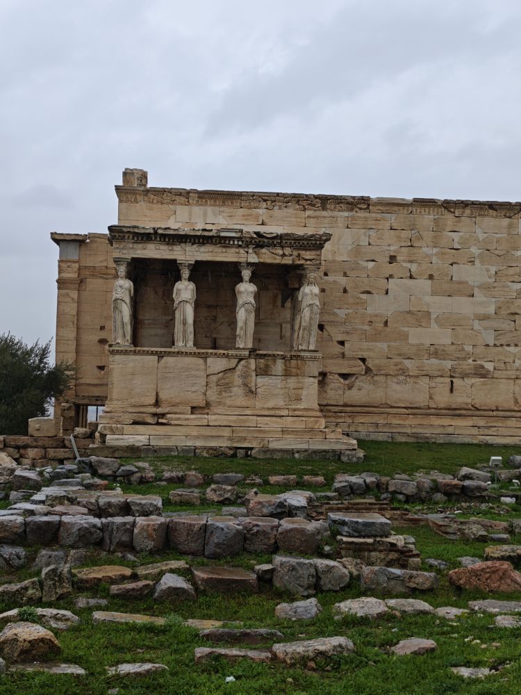 雅典卫城,应该是最重要的参观地。我和大儿子到达的当天在卫城对面的狼山看卫城,之后在不同酒店的顶层看清晨和夜晚的卫城, 但是真正走进去看卫城我们一直等到平安夜那天。之前在希腊的六天,天气每天都很好,平安夜那天,天气预报说要下雨,但是看预报应该是下一会儿,停一会儿。我们母子三个人吃完早饭去卫城排队买票,进去一会儿就开始下雨,我这才发现卫城里面基本上没有躲雨的地方,而且雨越下越大,最后大到实在无法在里面待了,我们只好匆匆出来,即便早早出来,我们也已经被淋成落汤鸡了,这次很遗憾没能地把里面的每一处都好好欣赏,看来雅典以后还要去一次。
