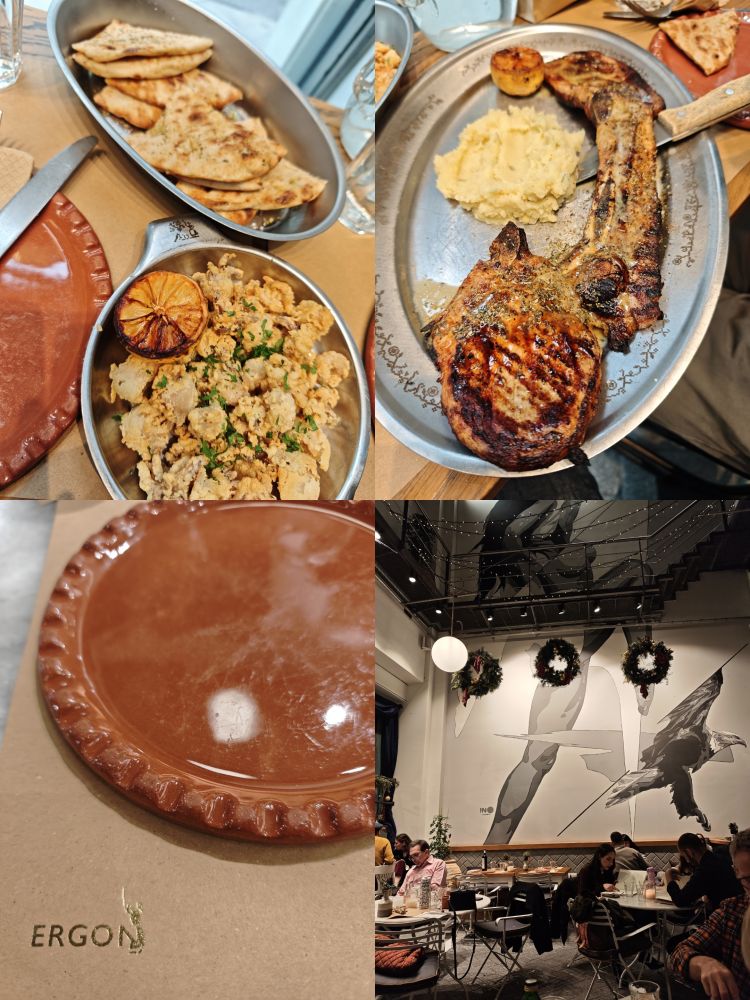 米其林推荐的餐厅 Ergon也是我们逛街的时候看到门上贴着好几年米其林推荐的标志而走进去的,里面不仅有餐厅,也有超市,人很多,座位很小。我们去的时候完全没有位置,但是大儿子预定了一小时后三个人的位置。我们出去逛了一圈再回来的时候,又等了十几分钟才给我们安排了一个非常挤的位置。隔壁桌的一对夫妇桌上有一款pita 面包,看着挺诱人,于是我们也点了一份,确实好吃,在这家我又点了炸墨鱼圈,烤猪排,希腊沙拉,味道不错,价格亲民。26号一早小儿子就去机场开始他长达七周的东南亚背包客之旅,我和大儿子是傍晚的飞机,所以去机场之前,我们又去吃了一顿。