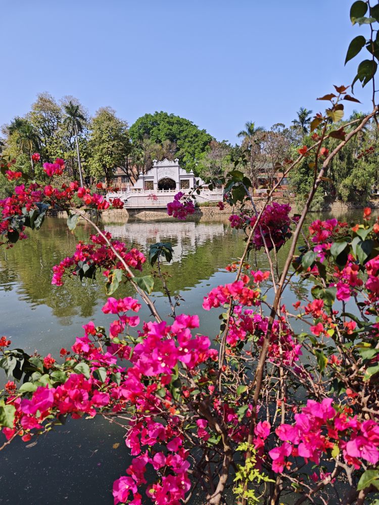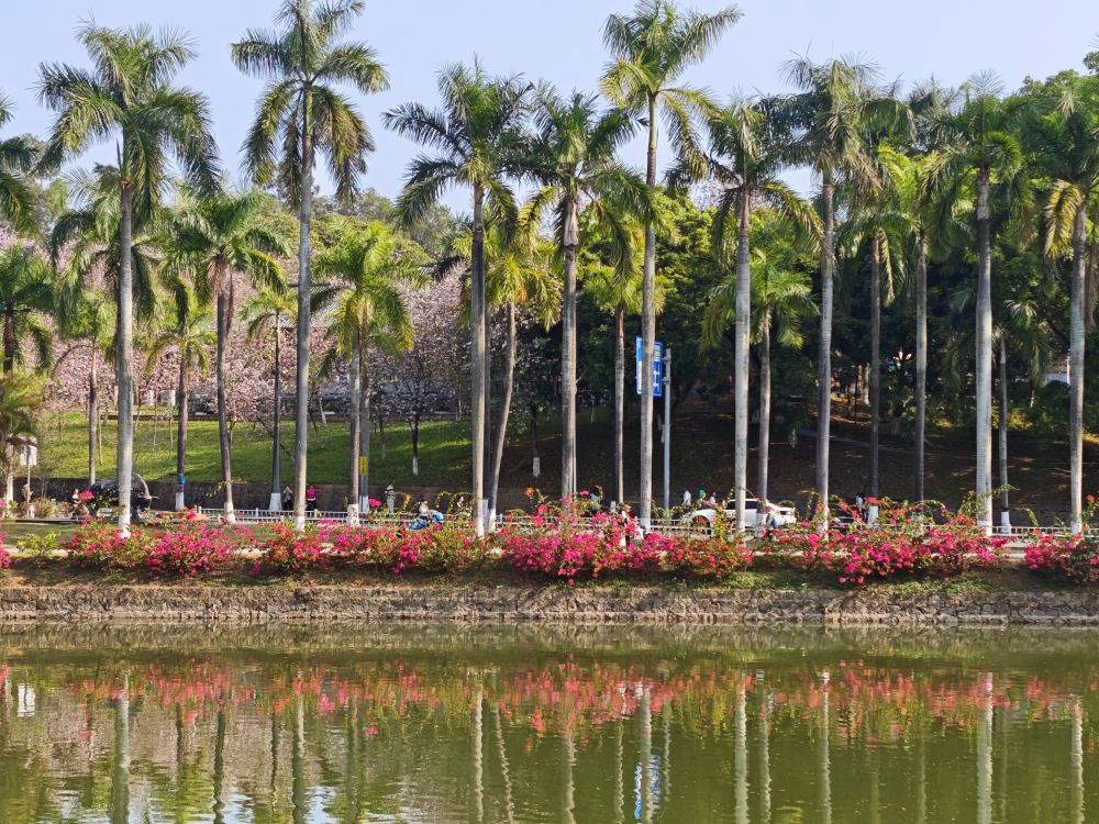 从湖的对岸看三角梅和棕榈树后面成片的紫荆花?