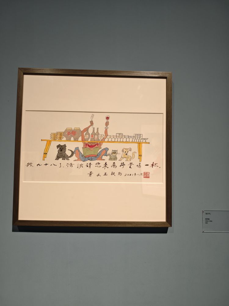 第一次看展没看成,三天后,我吃完早饭就出门了,终于得以在美术馆慢慢欣赏黄永玉的画。周内的上午,展厅里面居然人不少,看来很多人都喜欢他的画。这是一位非常有童心的老人的画作。他的画,你一定要读画中的字,有点话痨,却写满了心情。 有一句:明确的爱,直接的厌恶,真诚的喜欢。站在太阳下的坦荡,大声无愧地称赞自己。多酷!这大概就是每个人都向往的生活姿态吧。