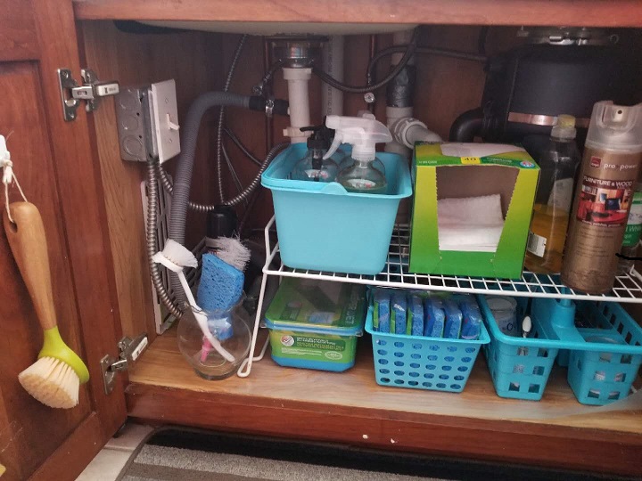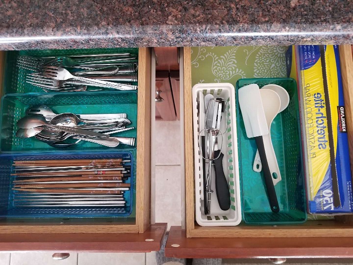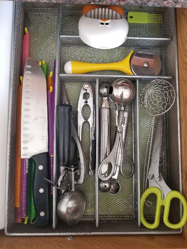 下图我用了两个简易的office sorter, 算是家里东西废物利用吧,上面是刀板,下面是各种盖子。