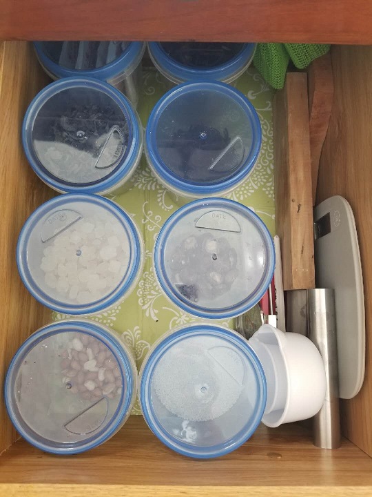 比较深的抽屉,半透明盒子,存储所有的干货。前面有朋友建议不要用塑料制品,我也将学习逐渐淘汰这些塑料品。