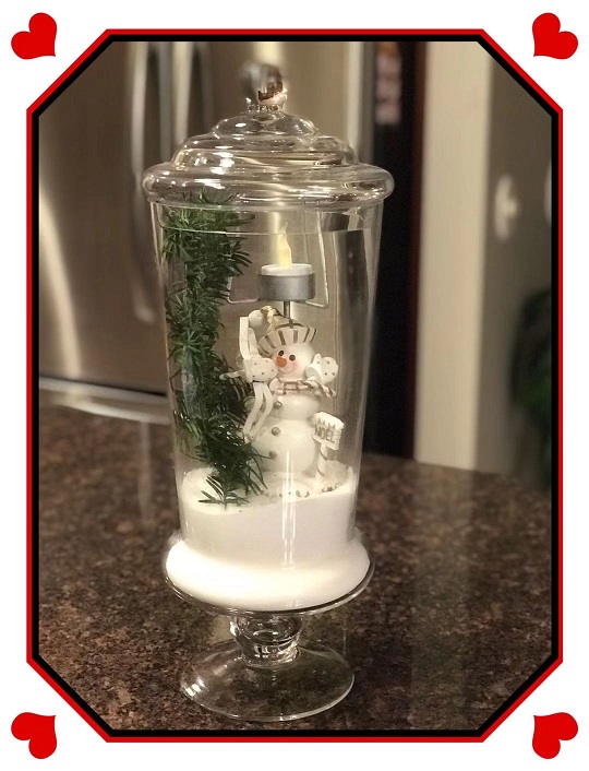 1、我超喜欢这种药剂师大瓶,胡乱一搭就是一个景。前年瓶里装的是水果,去年装的圣诞球,今年换个玩法,倒入1罐盐,加了2根松叶,一个小雪人烛台,搞个“雪景”。
