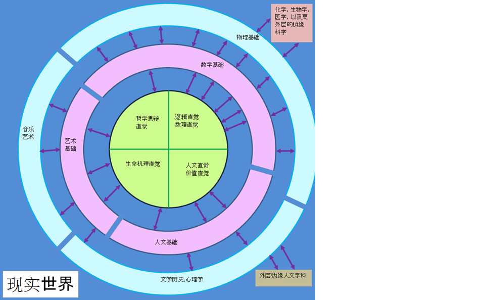 对于数理基础教育,图中最需着重的就是人的底层直觉与数学基础间的链接,还有就是物理与数学基础之间的链接。这些链接通了,人的几层知识模块合为一体了,成年后的专业学习职业学习和学术研究才能变得游刃有余。这是当代教育的主要弱点所在,各种教育机构所重视的和家长所重视的是知识的总量,而忽视了知识模块间的这些链接。没有广泛而牢固的链接,所学知识终究是一些短期记忆,在数月之后便会烟消云散。运气好的,可能在知识的消弭过程中遇到一些情景帮助人建立并强化这些链接,从而使得某些知识得以与人的底层直觉相连并结构化;运气不佳的话,现实生活没有机会再唤起你的记忆,那些知识就很快消失了。