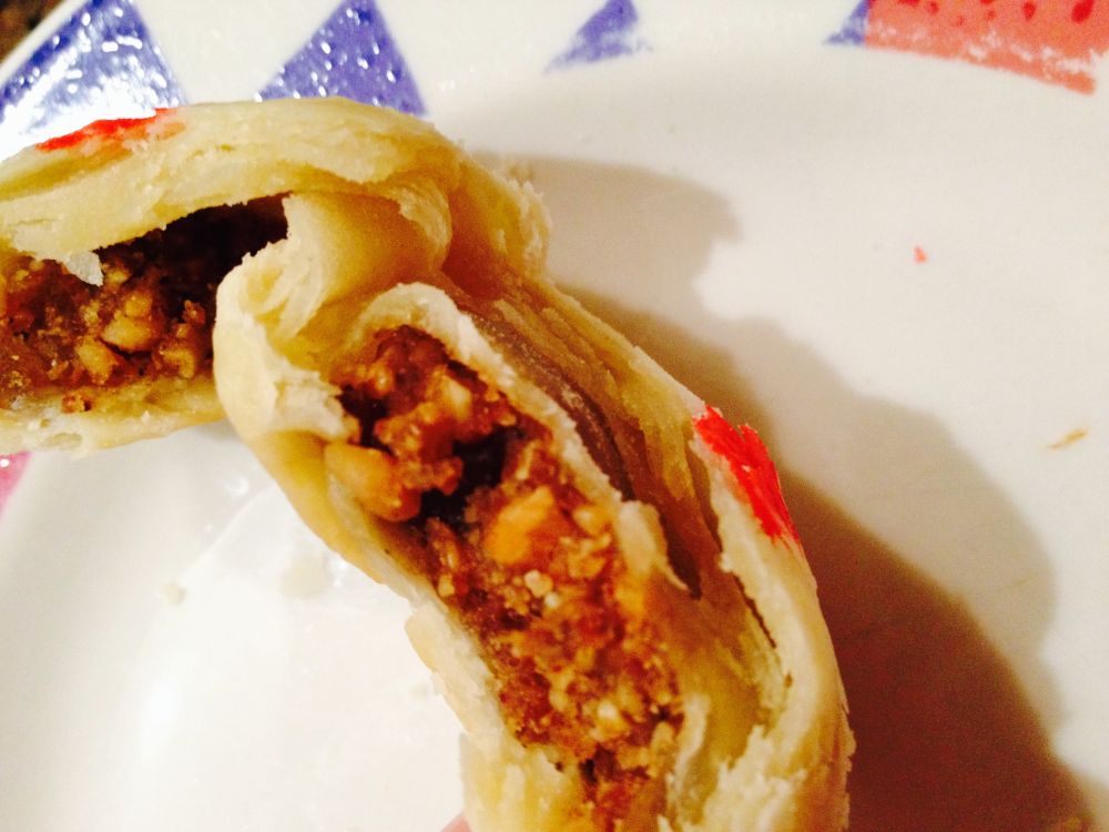 自己第一次尝试做的法式酥皮,难度非常大,虽然层次出来了,但卖相不佳。如果没有机器,很难压薄层 拧巴拧巴就成花生馅料法式麻花了:) 第一次做小酥皮蛋挞,还算成功,可惜没有漂亮模子 切开横面也不错,味道很正。 终于买到漂亮模子,但个头太大,只有六只。 有模子的蛋挞像个宝,没有模子的蛋挞像根草 :D 入烤箱之前 酥皮月饼,榨菜鲜肉的 椒盐桃仁馅的,层次出来了 椒盐桃仁馅料球 点缀了藏红花的鲜肉月饼 酥皮萌萌哒