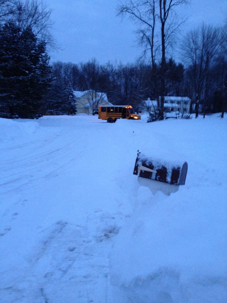 月落灯稀寒满天,信箱几被暴雪掩,晨微曦中候校车,睹儿孤影惹娘怜。