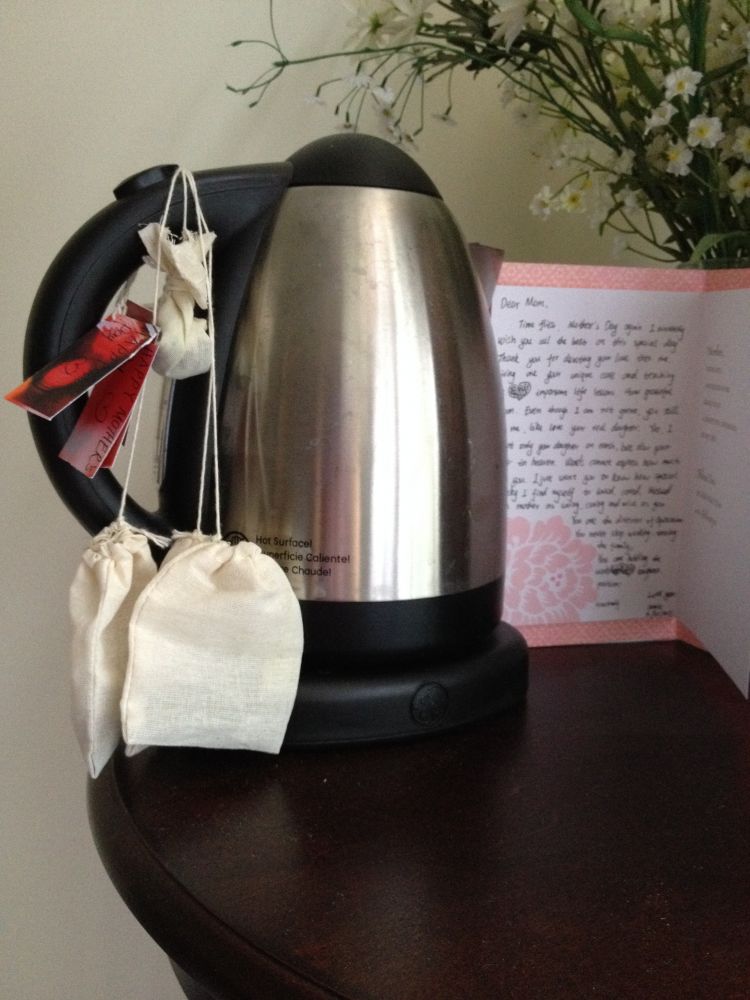 再说女儿,她一个月前就张罗要给我买SPA的礼券,又要送给我心仪已久的LC炒锅,最后又问我想給我预定哪家餐馆吃饭。贴心的小棉袄啊,我都微笑无言婉拒了那不可承受的挚爱之重。母亲节早上,我卧室门外放着一小盒礼物和一张卡片。礼物是闺女从有机食品店买来的茶包,亲手装了四袋有机大麦绿茶包,自制的标签纷飞着爱;那粉红透黄的精致卡片上写了半页: