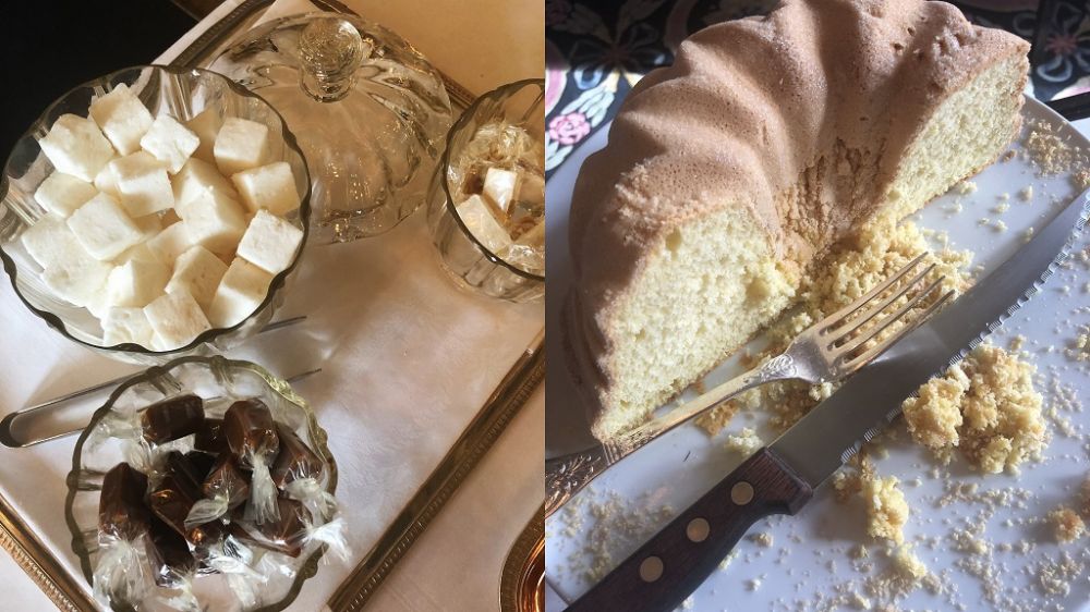 左边这小点的颜色可是由甜菜提炼出来的。右边是正式的甜点:果仁巧克力饼。