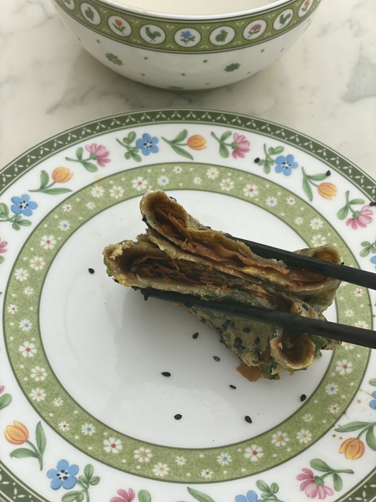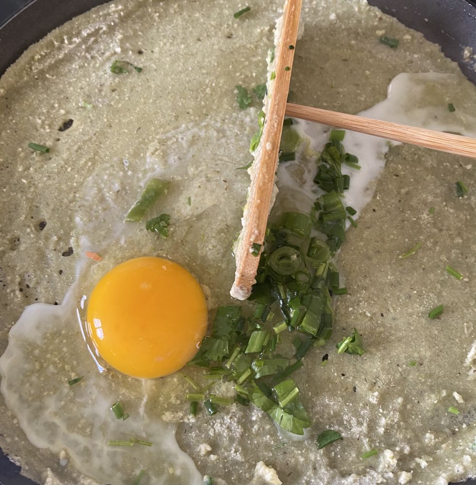 传统的煎饼果子要用绿豆面,看看俺这个面皮是不是有点绿绿的淡雅?