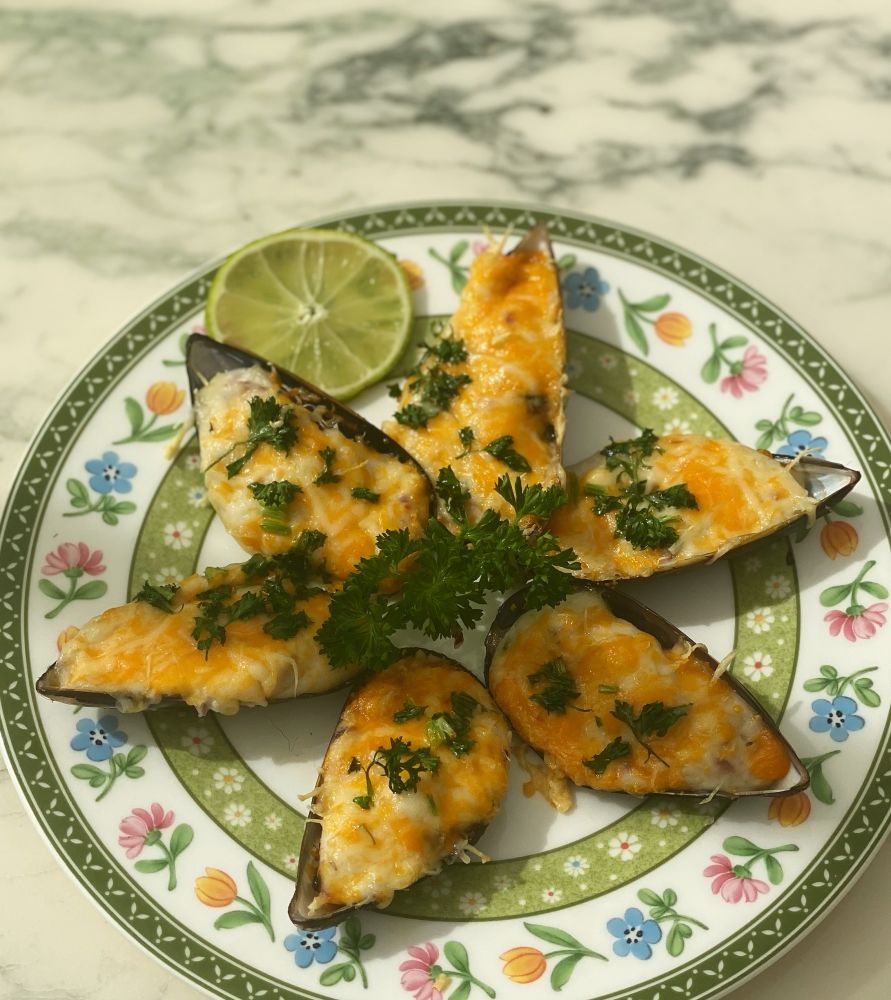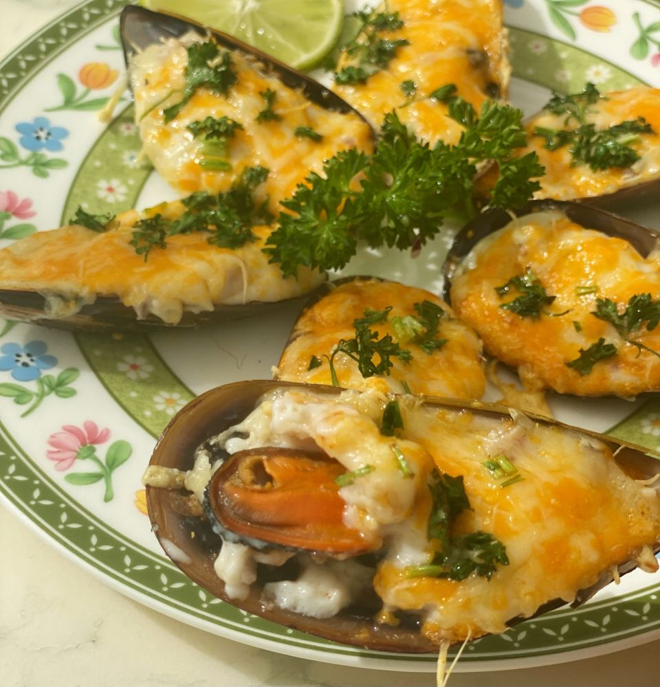 芝士焗青口,复杂一点,因为需要熬一个白酱。芝士烤得脆脆的,里面配着饱满的奶油糊,味道香浓。