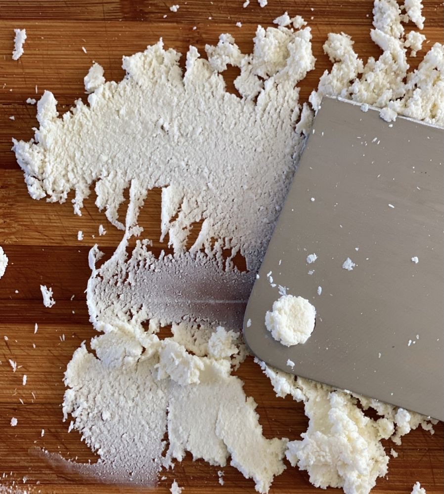 4 用刀背将凝固的牛奶研磨成细粉状,只有经过这一步凝固的牛奶才能成型。