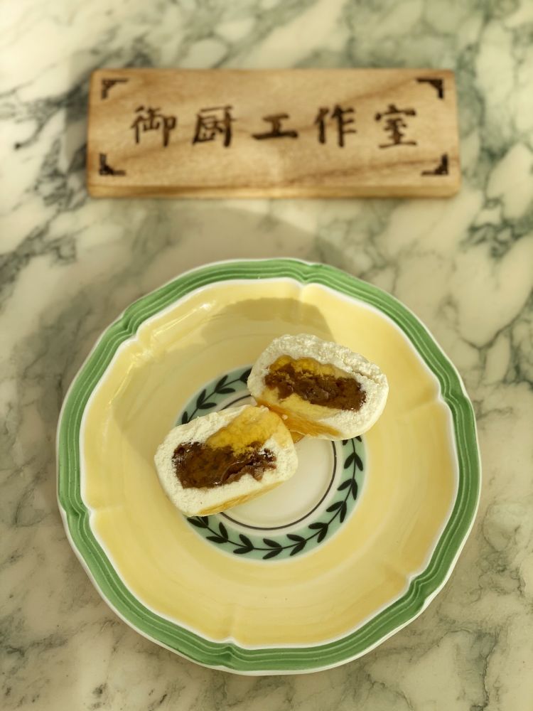 传统的馅心应该用山楂、芝麻、白糖,我自己做的用了栗子馅儿。