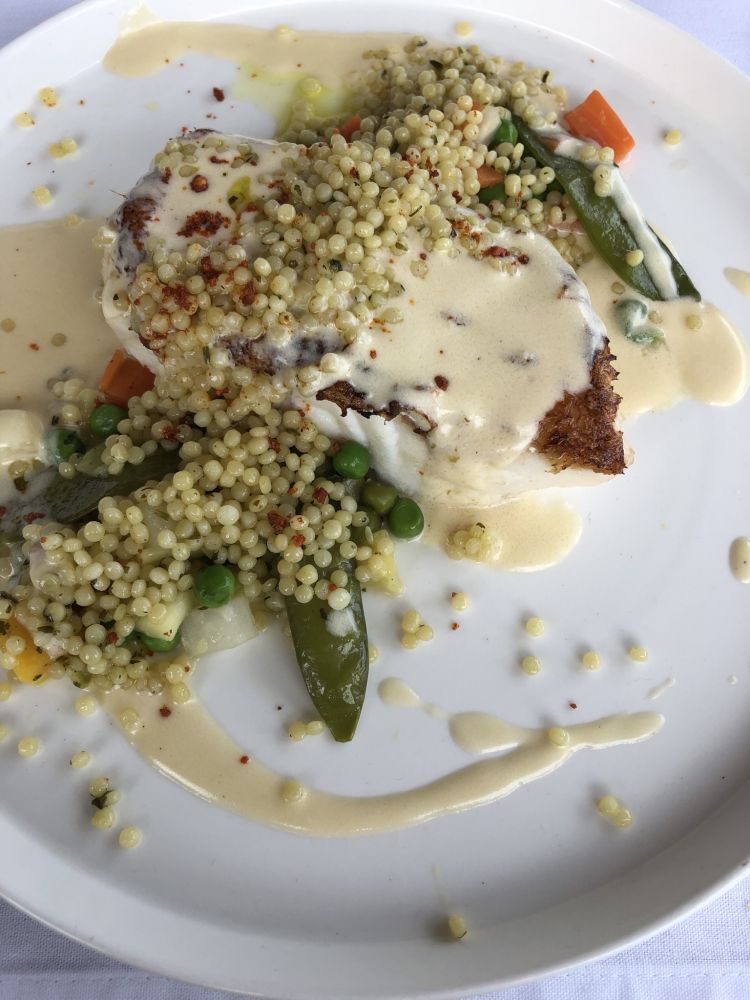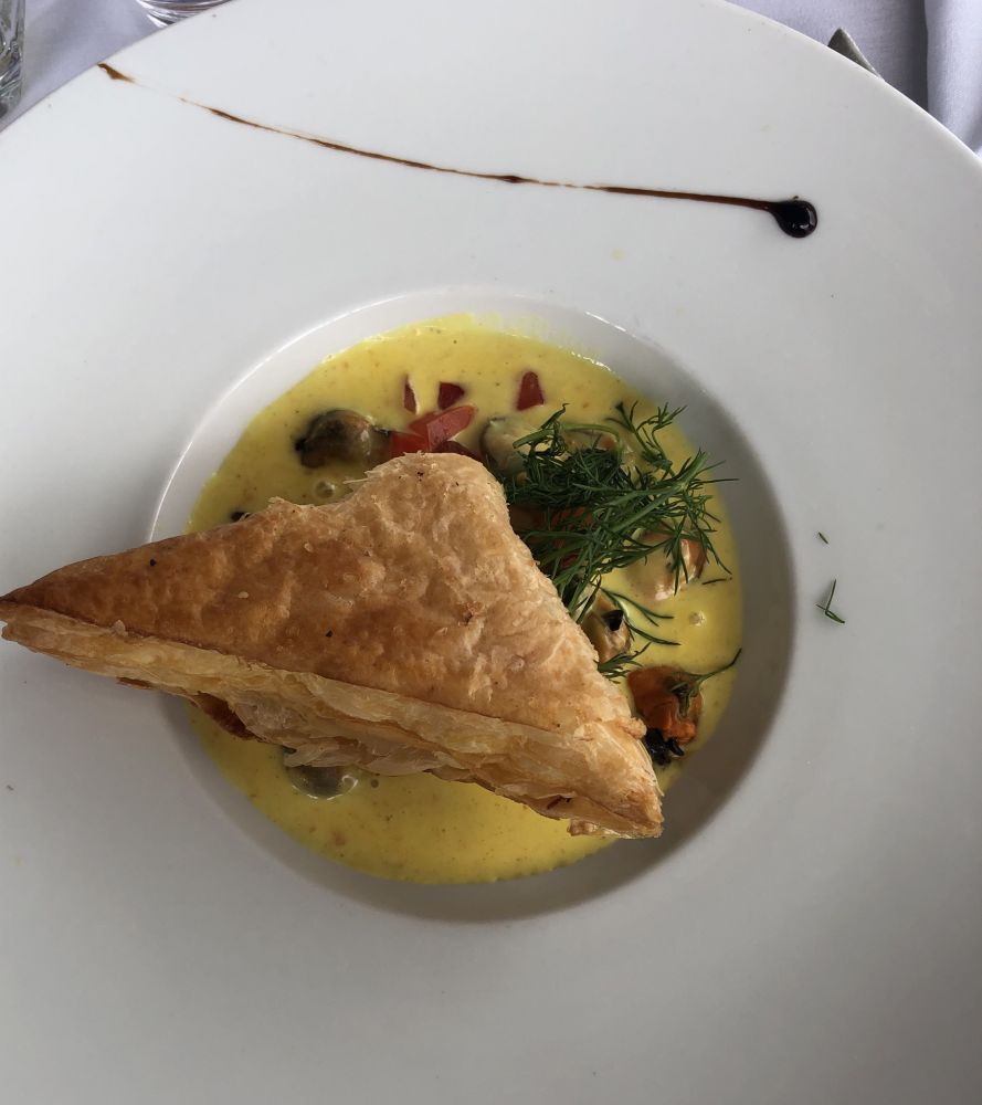 第一次吃Rouget(绯鲤),鱼肉很细腻。配的主食是蔬菜汁和面做成的小面球。