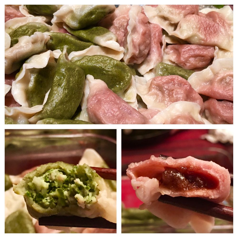 红色的饺子是糖饺子,就是一份面和两份红糖混匀包起来当甜点,其他都是一样的肉馅,不过随机包了两个其他颜色的糖饺子,这是北方人的习俗,以前有用分币包的, 有吃到的人新一年会有好运气一说。
