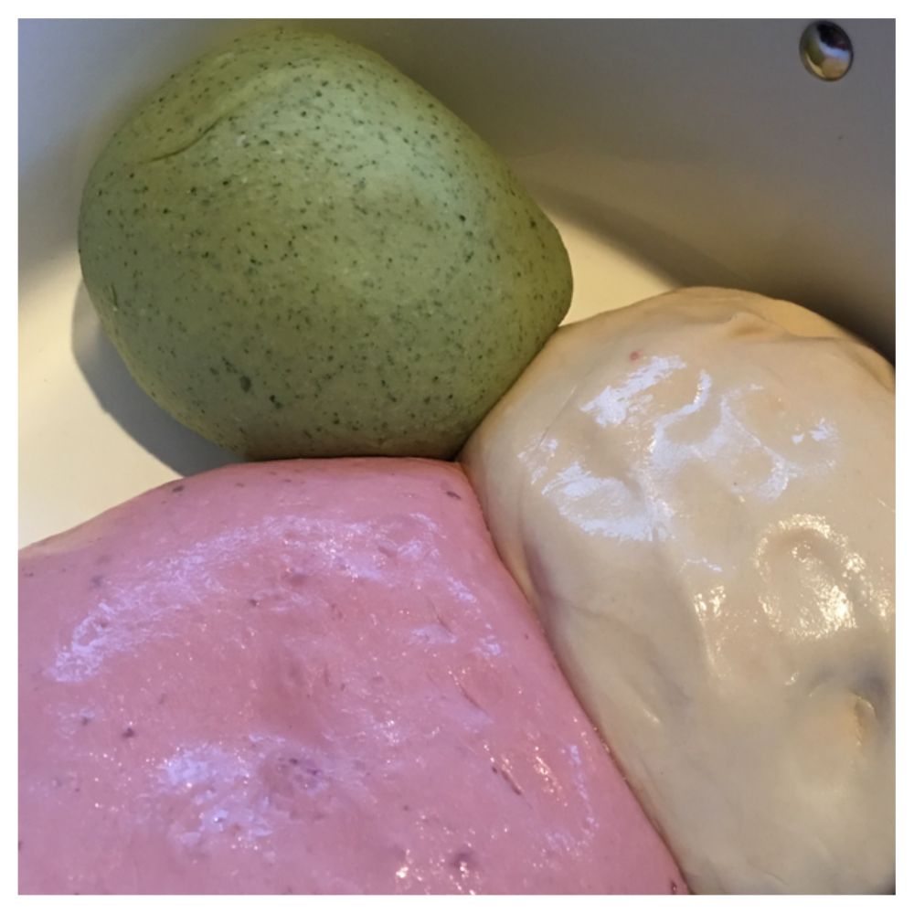 和了三种面团,一种放了beet汁是深粉红色,一种放了绿菜汁是绿色的,还有面原色的。都是机器和面榨汁,不费特大事。