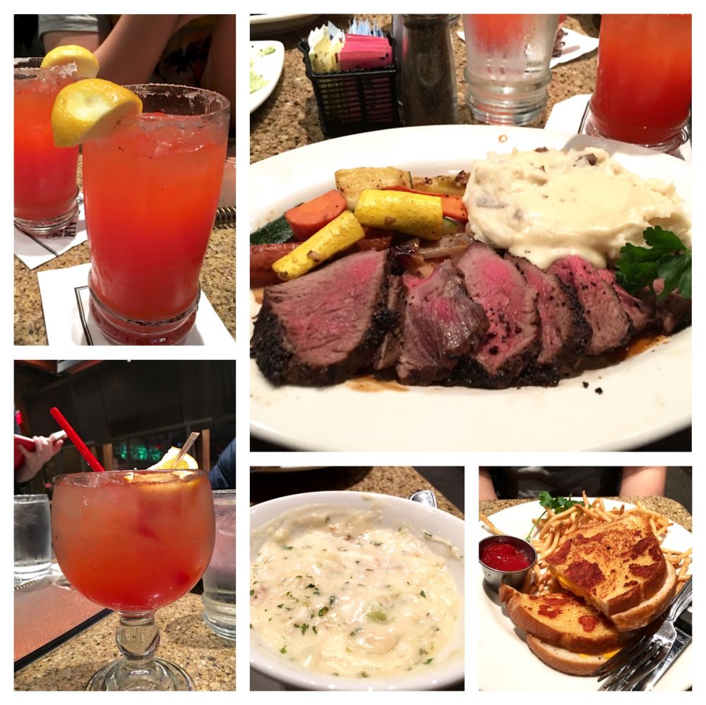 晚餐吃的西餐,salad,牛排,烤鸡,grilled sandwich,clam chowder,巧克力冰激凌蛋糕,以及喝的草莓柠檬汁鸡尾酒。