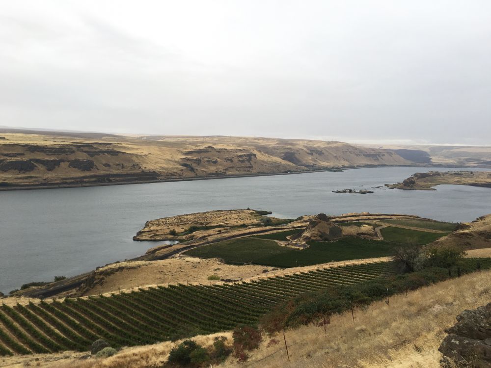 她的餐厅和教育中心外面露台上看到的哥伦比亚河谷和葡萄园。这里一年时间大部分时间是晴天,我们这次去却赶上了少有的阴天。