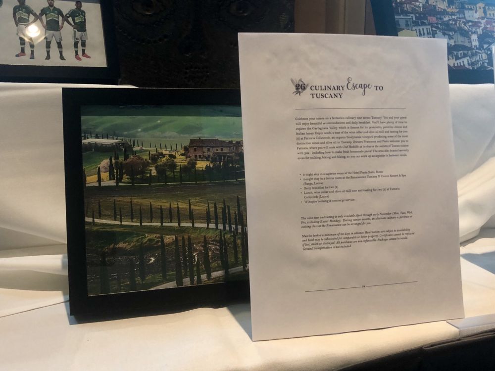 竞拍的东西太多了,各种分类:家装花园,户外探险,珠宝美容,美食美酒,旅游度假,不一而足。现场竞拍和晚餐前,是silence auction,我没有参加之前网上竞拍,看到现场的项目,果然有了剁手的冲动。在几样东西的单子上写下名字,其中包括一个party package,一个六人winery tour,四张wheel forture production入场券。