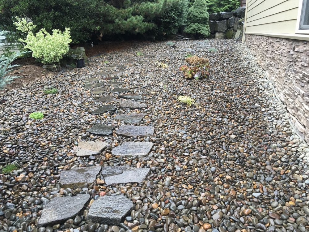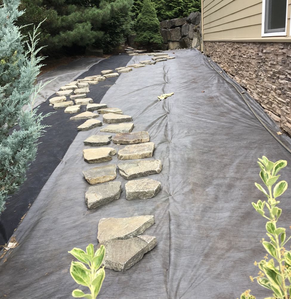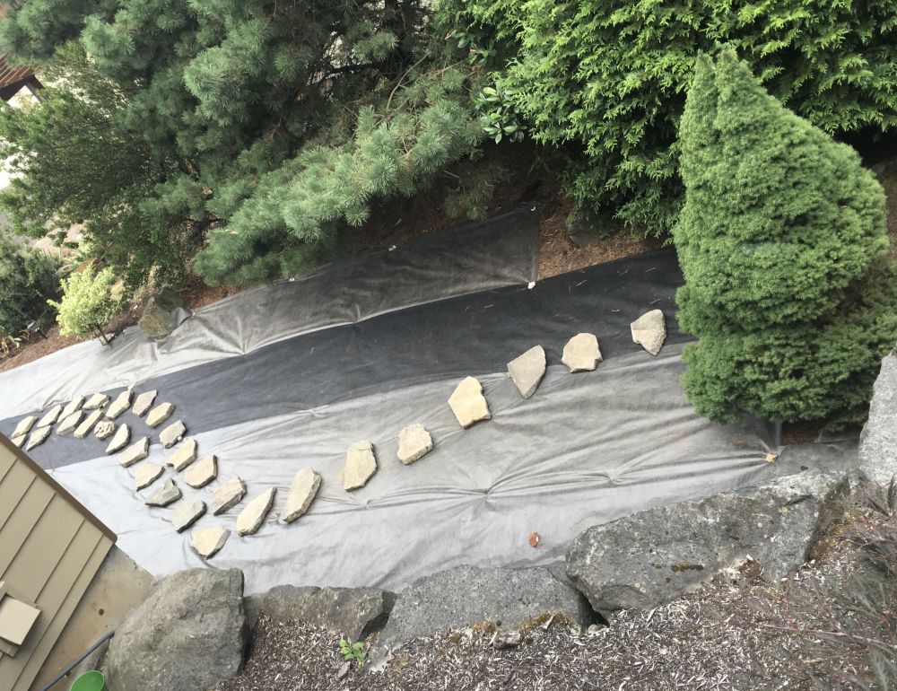 领导找时间铺了两层weed proof,他做事比较磨叽,但是质量很有保障。另一点是,本来最好是先铺一层细沙,这样片石会坐的比较牢,但是我嫌麻烦就省了,领导还和我唠叨了一下,我没有理他的岔,现在看来是没有问题的。也有可能是本来地上的草坪没有去掉,那些草也提供了一定的cushion.