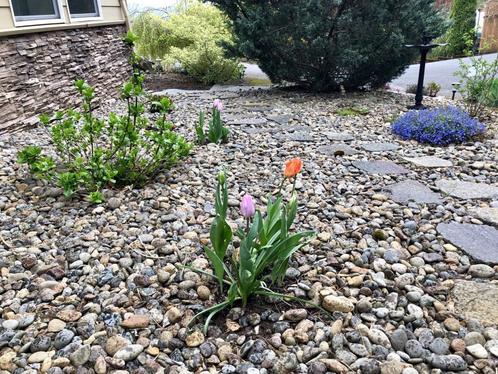 侧院本来有一片小草坪,但是因为和后院之间有一堵石头墙,每次割草比较麻烦,而且杂草乱长,总是没有好办法,又不愿意用除草剂,我就一直想做一个低维护的花园。看了好多做院子的主意,houzz里找到好多喜欢的花园样板,我终于决定要做一个石头花园。