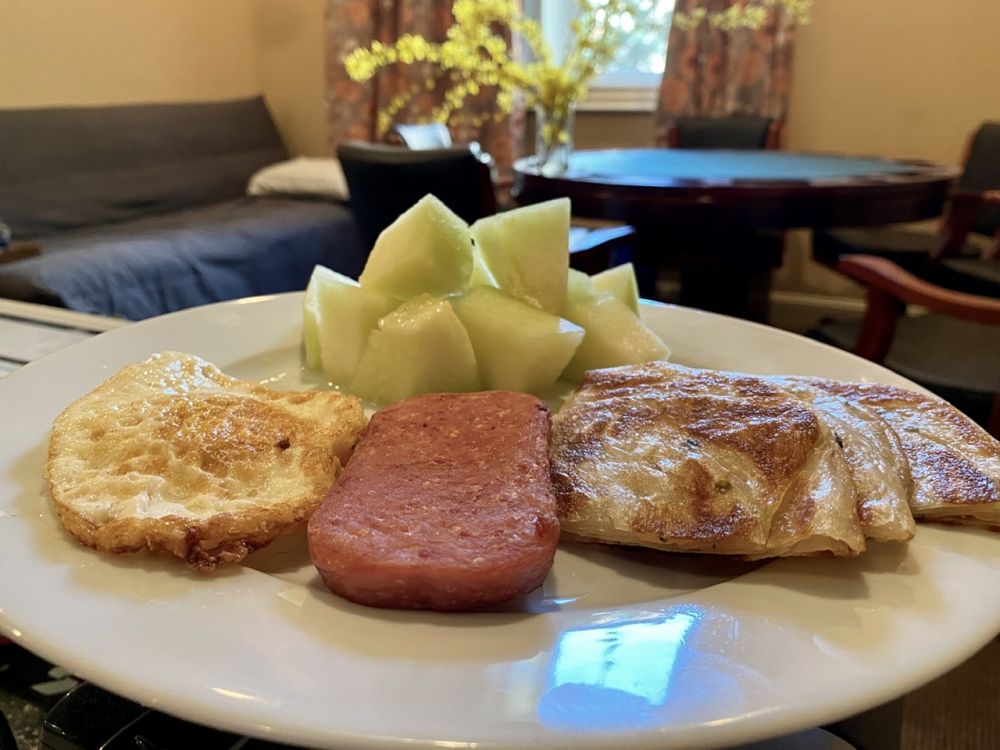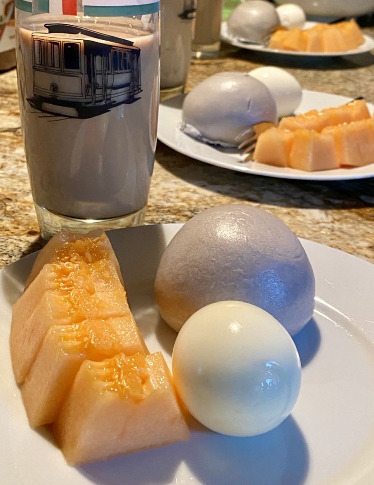 早餐:芋头包鸡蛋哈密瓜奶茶。