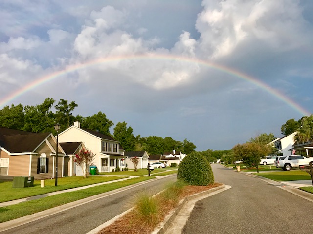 正好雨过天晴清新如洗,一轮绚丽彩虹高挂天边