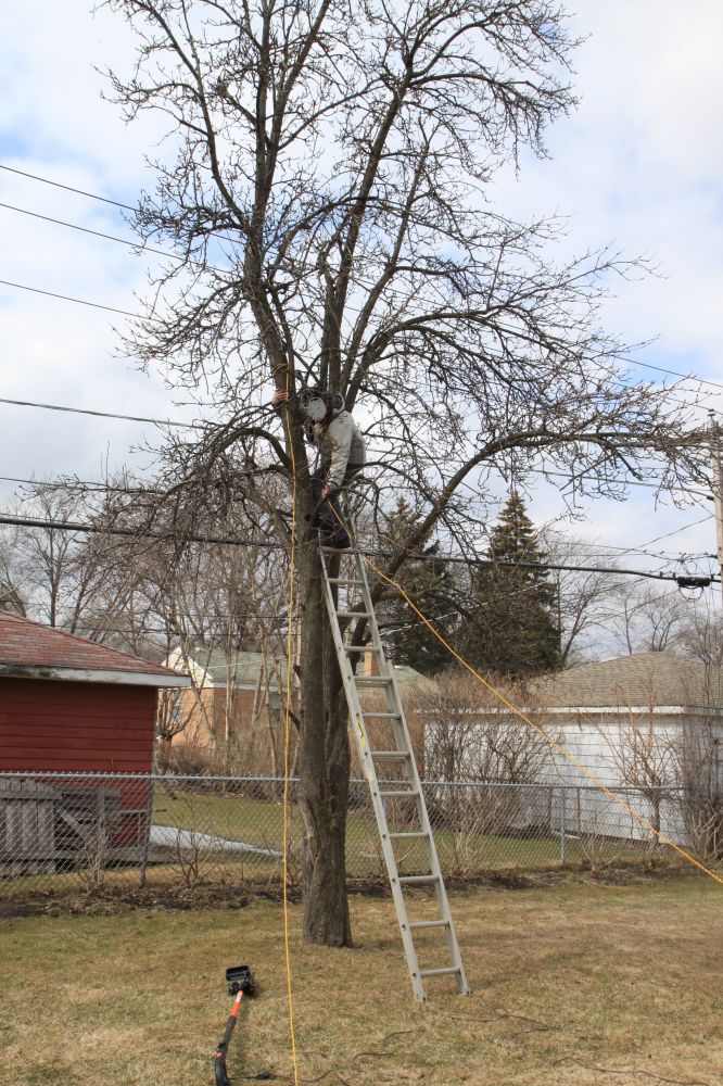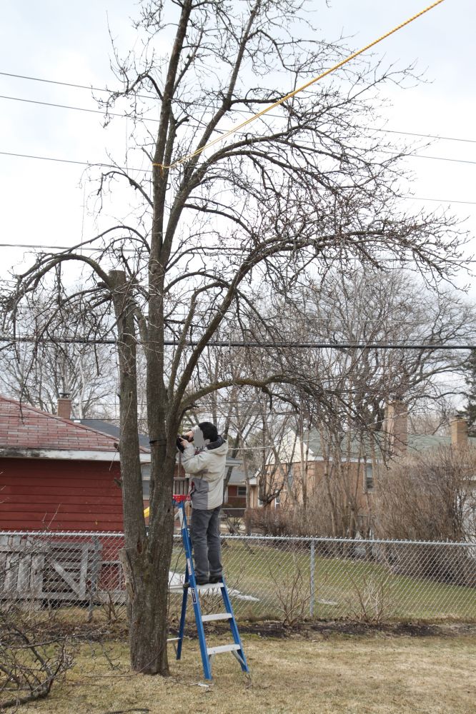 后来老爸说其中一根主干还是留长一点吧,所以有根主干没有完全按照树童的建议。老公原先绑的地方就不够高了,老爸亲自上阵,把绳子绑得更高一点。