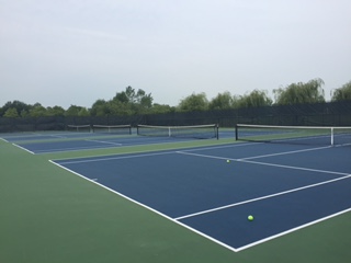 (夏季,球友们经常一起打球的球场,一个匡字型,共12个场地。)最近,USTA出了新的评级名册,其中几位相识的球友晋了级。晋级,代表着球技的增长和赢赛的增多,于是发出衷心祝贺。昨天,去了久未登门的网球俱乐部,队长Maria告诉我,教练Dan把我的名字放进了CITA3.5的级别里,这么说,一不小心,咱也晋了级。