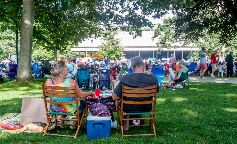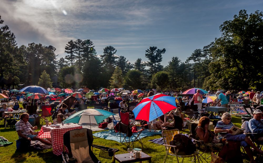 库塞维斯基大棚(Koussevitzky Shed,露天剧场)周围的草坪上已经有不少人支起了五颜六色的阳伞,摆开了各式各样的野餐用具,开始享受这个充满音乐的下午。很多人拉来了带轱辘的保温箱,正好当成小餐桌,里头应该是啤酒和饮料。还有成双捉对的男女,拿出了红酒,甚至架好了蜡烛。在月下的烛光里欣赏音乐和美酒,好不令人羡慕。