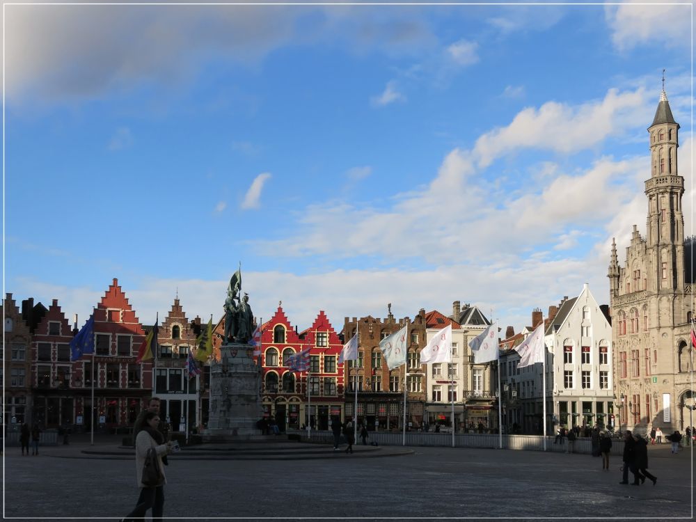 布鲁日市场(Market)广场,是布鲁日的心脏,中央矗立着14世纪奋起反抗法国专制的“金马刺之战”的英雄领袖,面向广场的是哥特式的市政府大楼和邮局,其它两侧并列的像圣诞姜糖饼干的山形房顶的建筑,宛如童话世界,这些童话的房子经常出现在布鲁日的各种旅游广告和商品包装上,这些黄金地段的房子如今都是餐厅和咖啡馆。