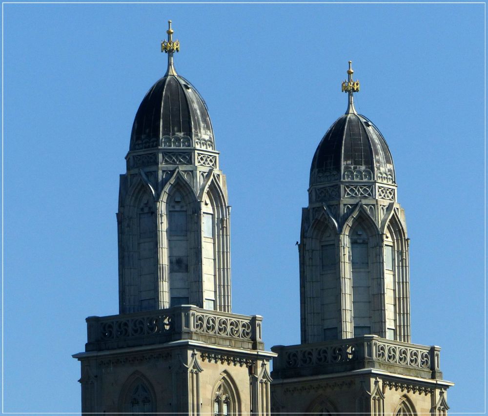Grossmünster苏黎世大教堂(右):又叫双塔教堂,其建筑风格以罗曼式的双塔而闻名,是苏黎世的地标。