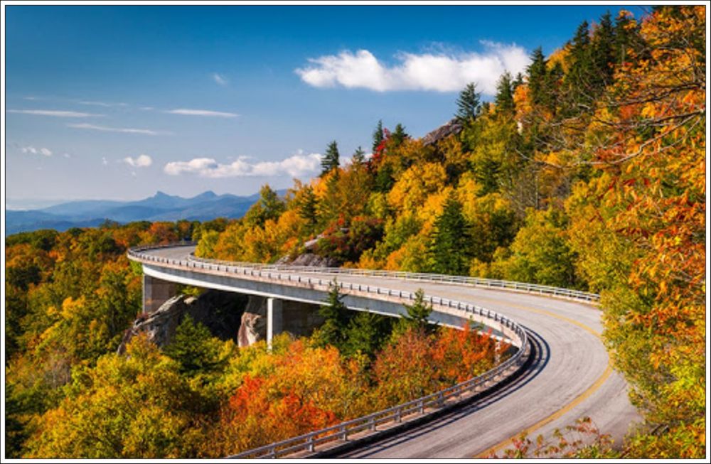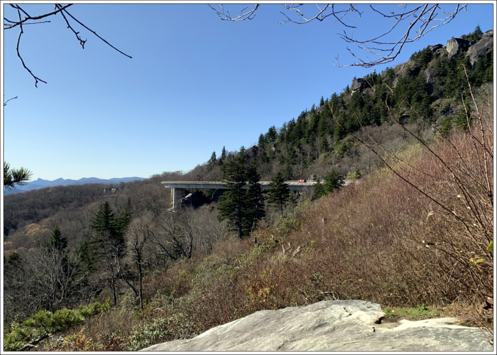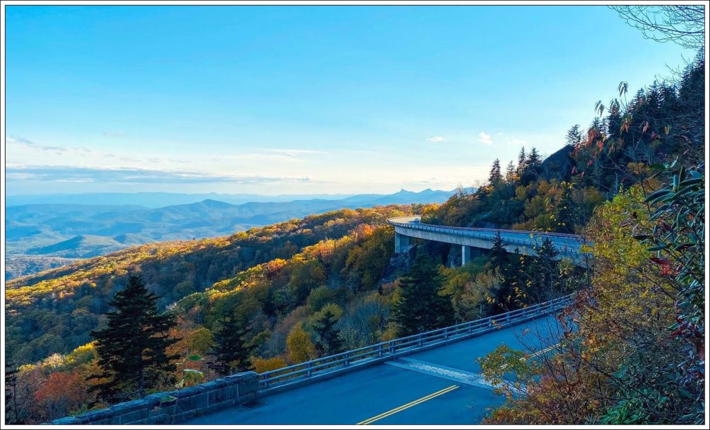 Blue Ridge Parkway上,叫Linn Cove Viaduct。从Linn Cove游客中心徒步半英里就可到观景点。由于没有在计划中,回程中特地绕道。可惜游客中心关门,秋色已经过去了。那一片山景很漂亮,是Grandfather Mountain State Park,有很多步道,找机会一定要来。