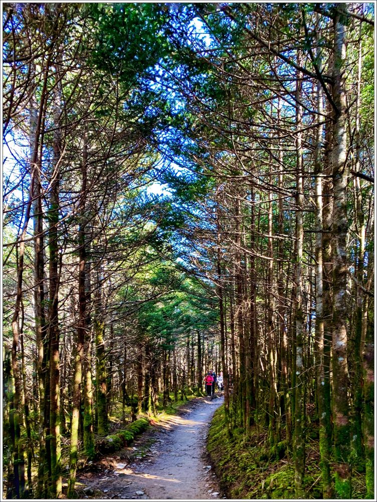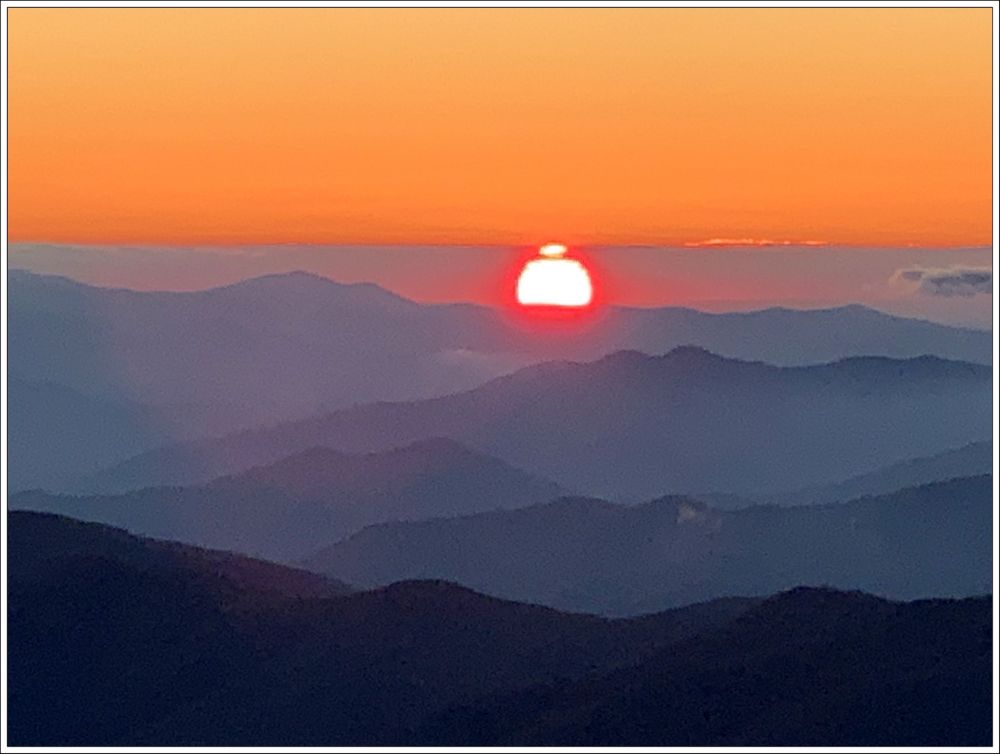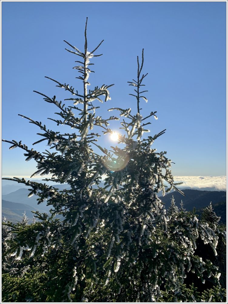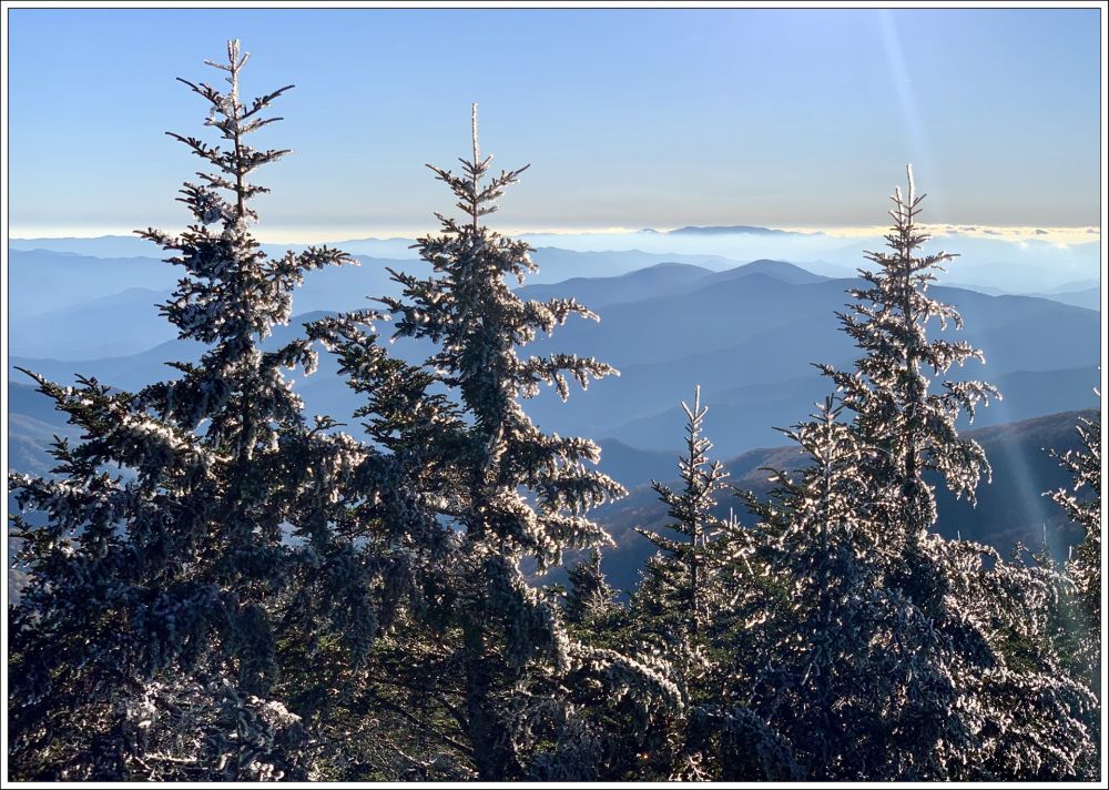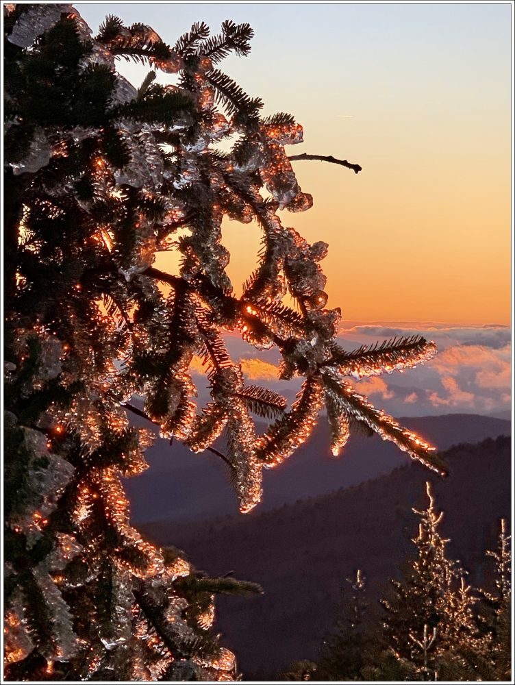 开车去Clingmans Dome山顶看日落,路上遇到大雾。Clingmans Dome 海拔6650英尺,是公园内最高的山峰。停车场是很好的观看日落的地方。去山顶的观景台Clingmans Dome Tower要步行半英里,爬高375尺(相当于27楼高),由于坡度比较大,不停走的话,有点累,路边有供休息的椅子。在观景台有360°的视野。刚到停车场注意到带冰的松树枝,煞是好看。大概是因为上午下过雨,山顶气温零下。在山顶不光气温低,而且风巨大,冷死!把所有带的衣服全部穿上,还觉得还不够。
