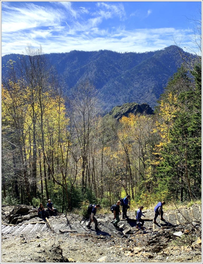 去大烟山除了看秋色,另一个目的是徒步,计划是全体徒步到Alum Cave,然后男士们继续徒步去Mt. LeConte山峰。另外想去的是Charlies Bunion步道,这是著名的2000英里长阿帕拉契Appalachian步道的一部分,在北卡和田纳西州的州界上。结果走了Alum Cave和Mt. LeConte第二天浑身酸痛,只好放弃Charlies Bunion步道,下次吧。