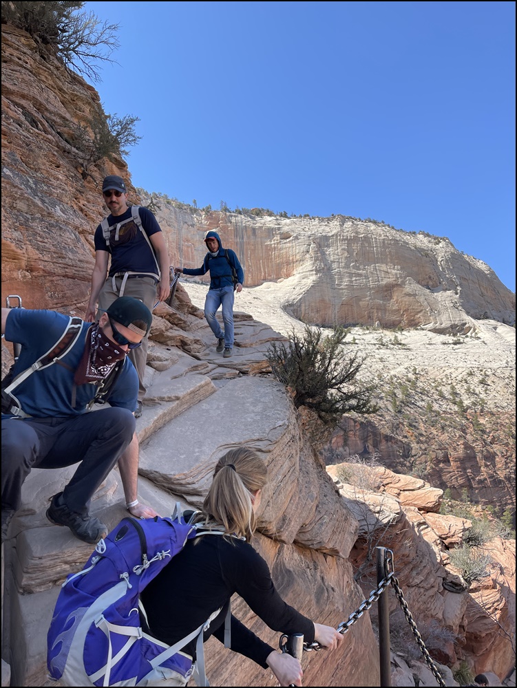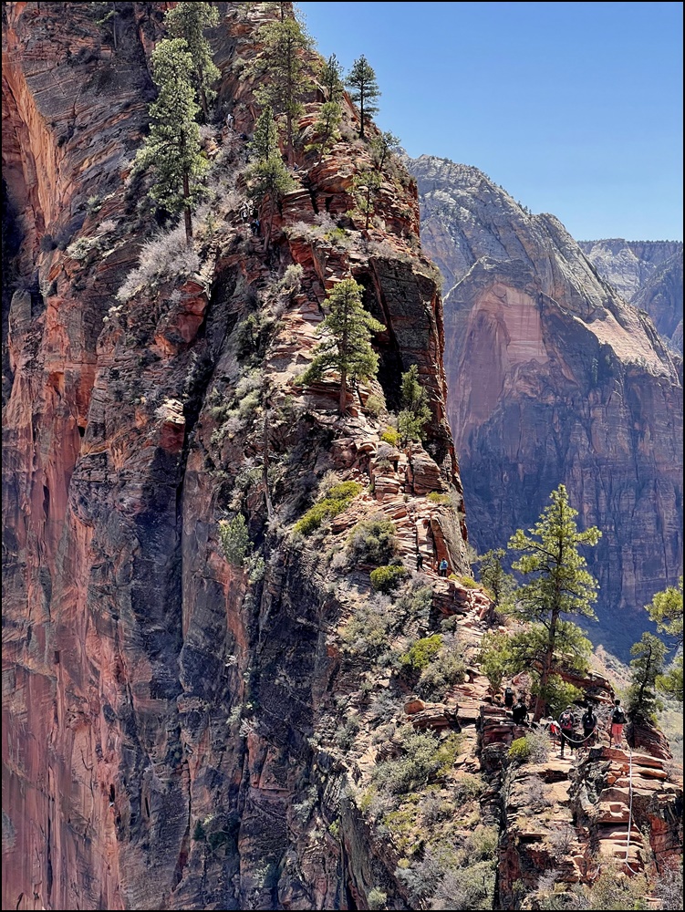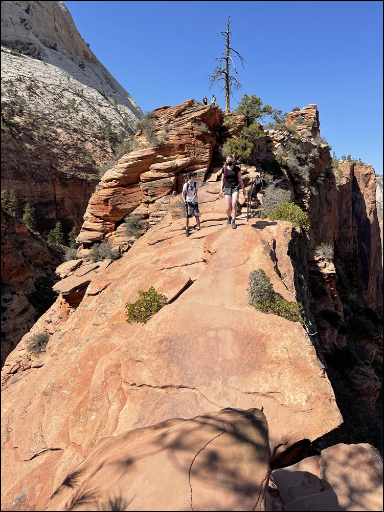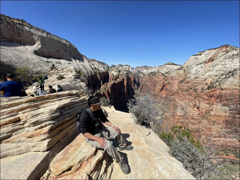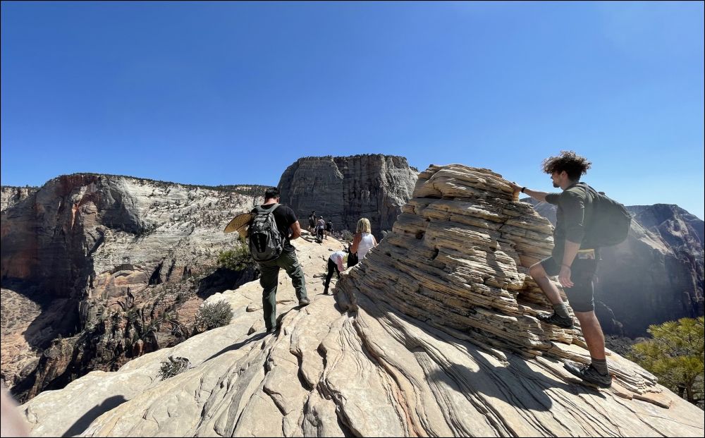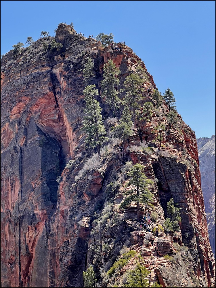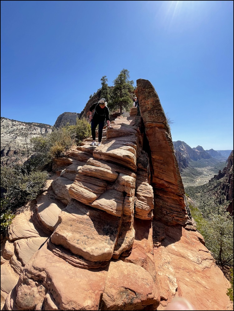 在Scout观景点和领导们会合,大家都很兴奋,她们高兴因为我们终于平安归来,我们高兴因为我们终于如愿以偿。看时间还允许,接着我们一起向上走了一段West Rim步道,这里有几个观景点,可以远眺Angels Landing,景色很美,建议大家不要错过这一段。看着刚才刚刚爬过这段步道,心里好不自豪。