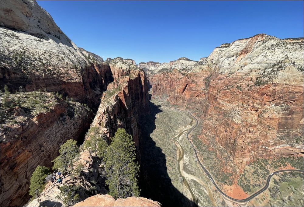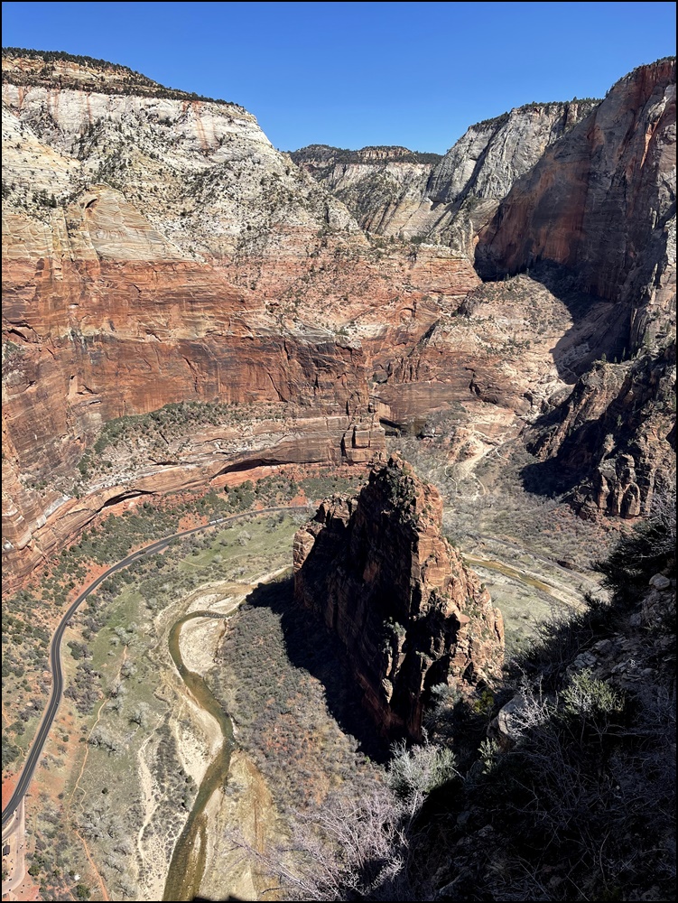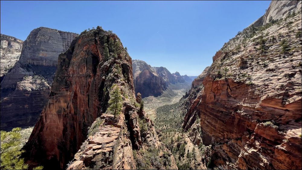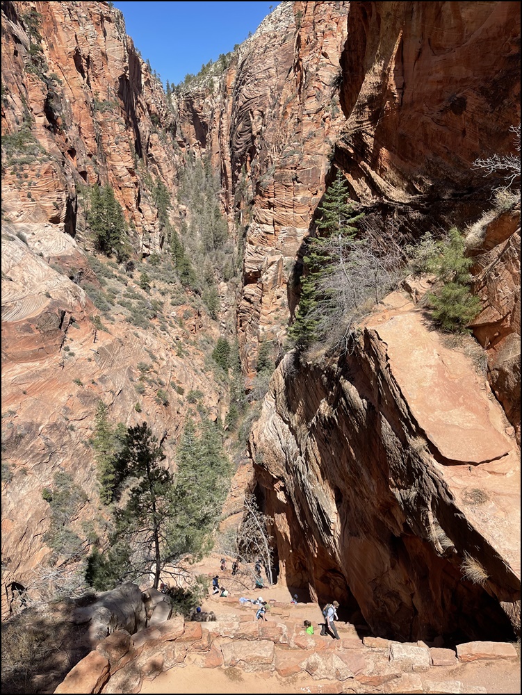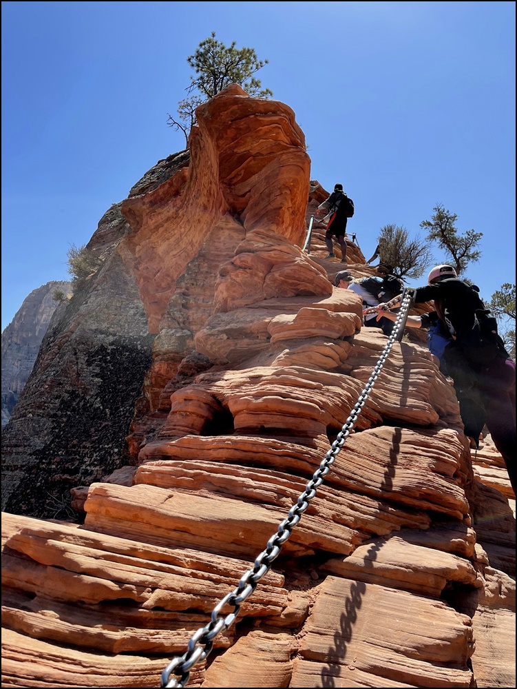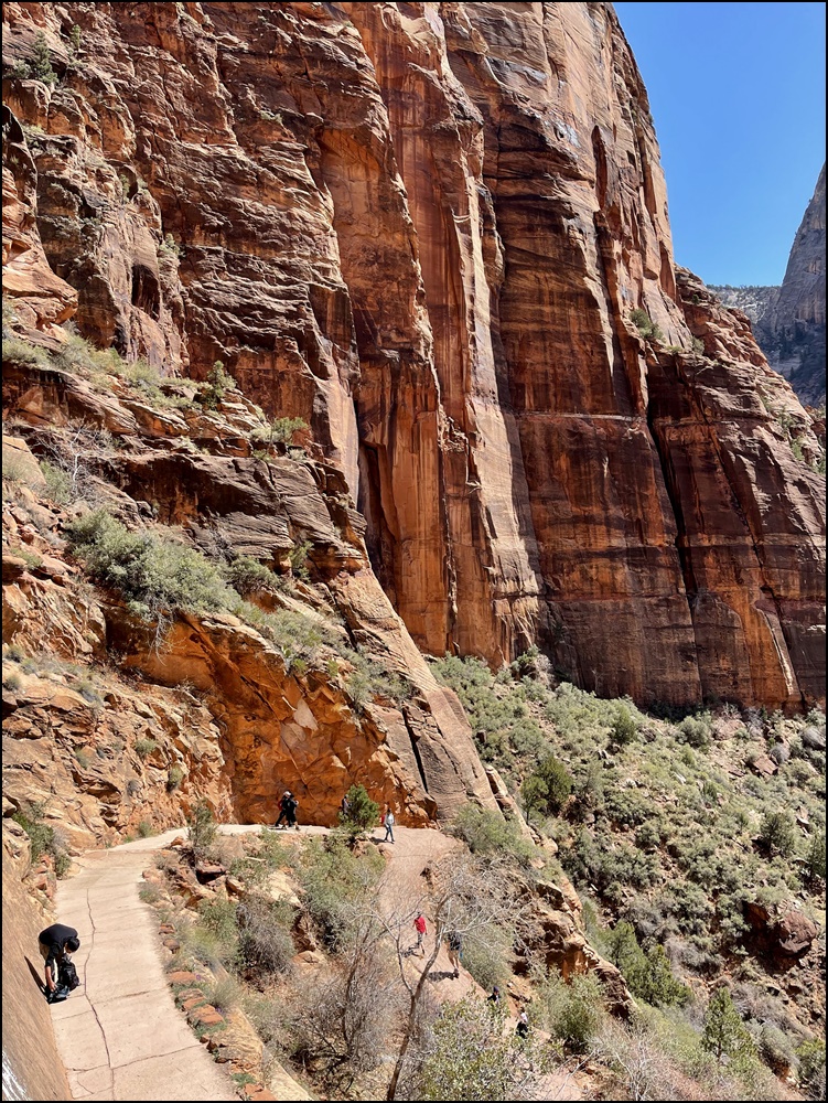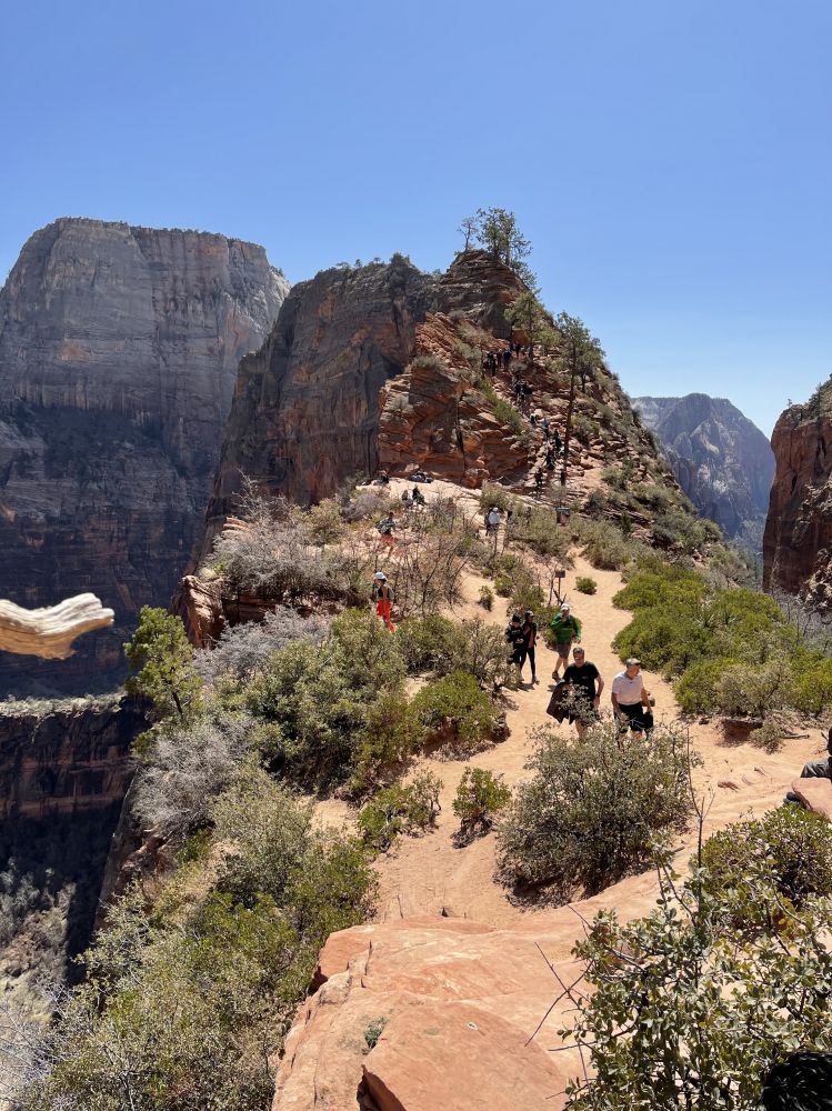 在Scout观景点和领导们会合,大家都很兴奋,她们高兴因为我们终于平安归来,我们高兴因为我们终于如愿以偿。看时间还允许,接着我们一起向上走了一段West Rim步道,这里有几个观景点,可以远眺Angels Landing,景色很美,建议大家不要错过这一段。看着刚才刚刚爬过这段步道,心里好不自豪。