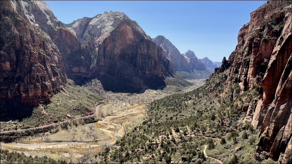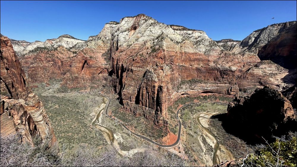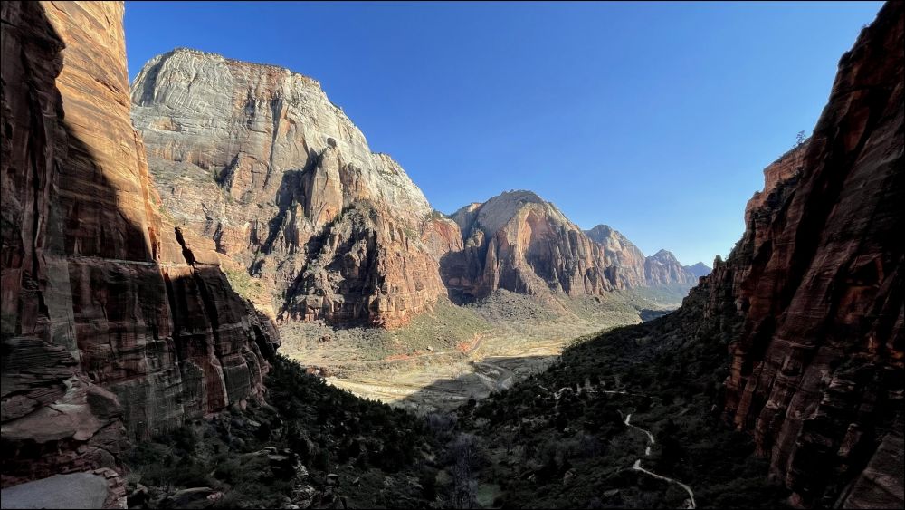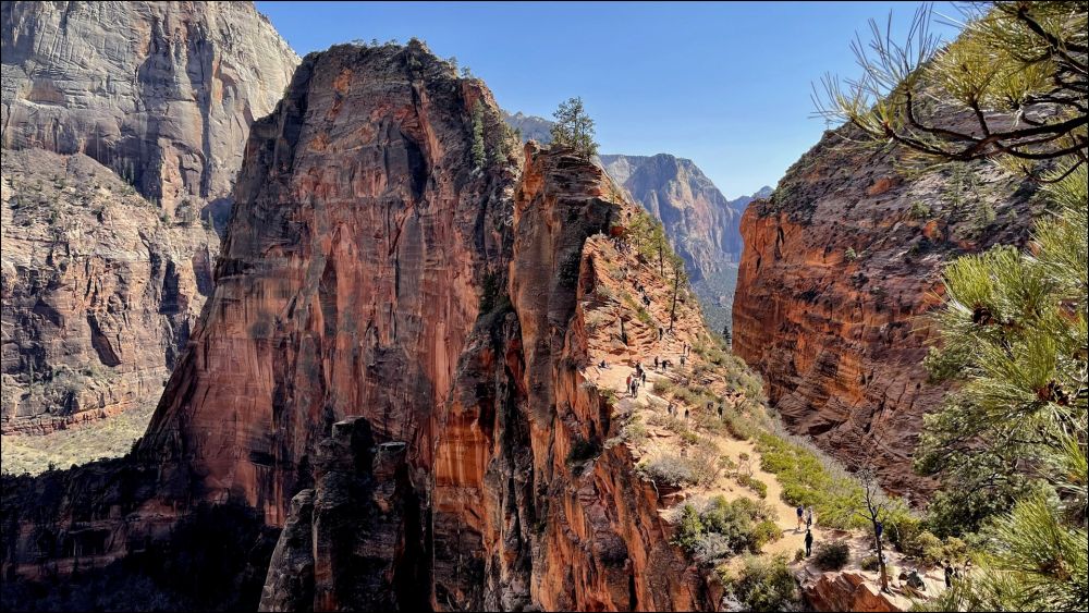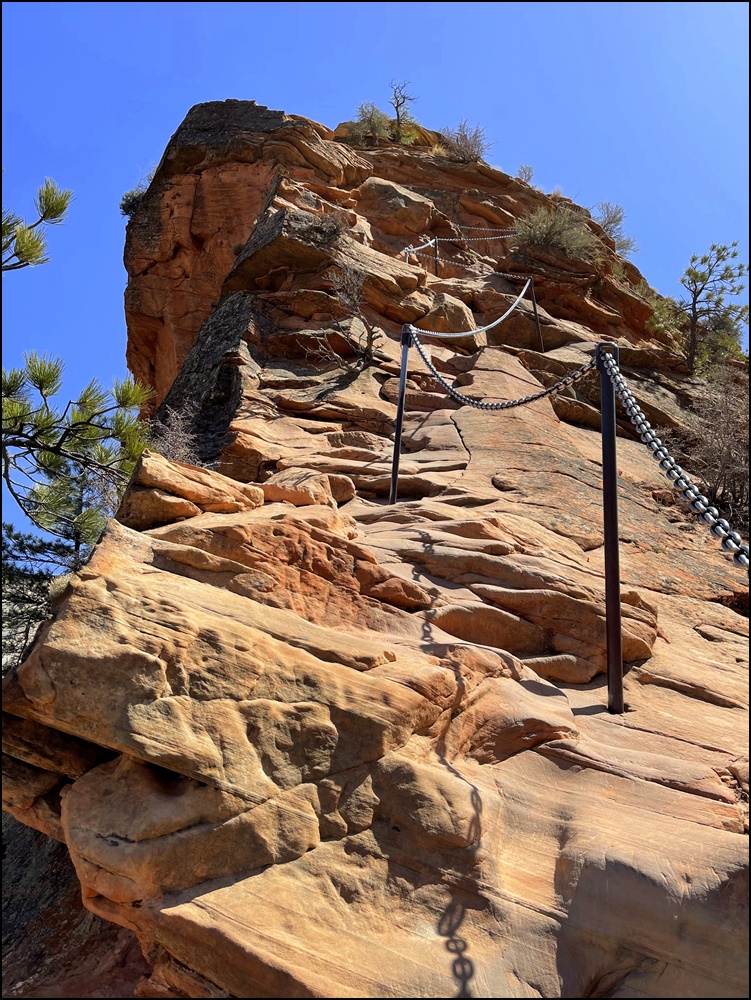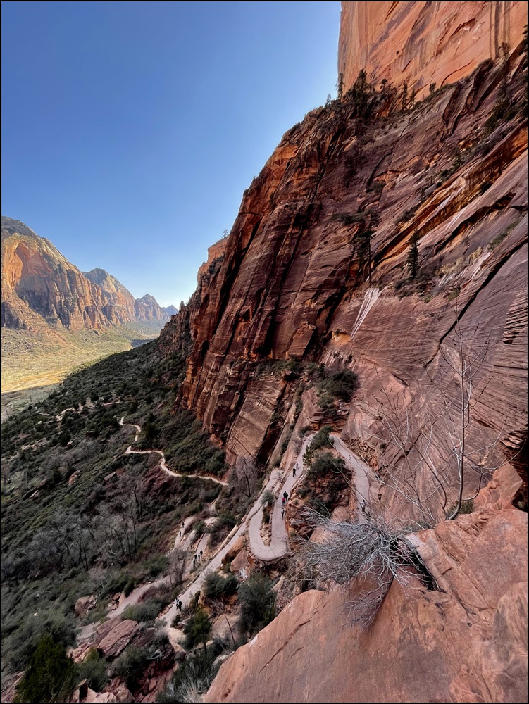 Angels Landing前一段不难,开始比较平缓,后面高度上升越来越快,行走基本上是在铺好的路上,一直到Scout观景点。这部分步道和West Rim 步道重合。到Scout观景点单程1.8英里,爬高1100多英尺,当中经过两段之字形路段,英文叫switchbacks, 其中一段很有特色,要转弯22次(见网络照片,估计用无人机偷偷拍的。公园里不允许无人机)。