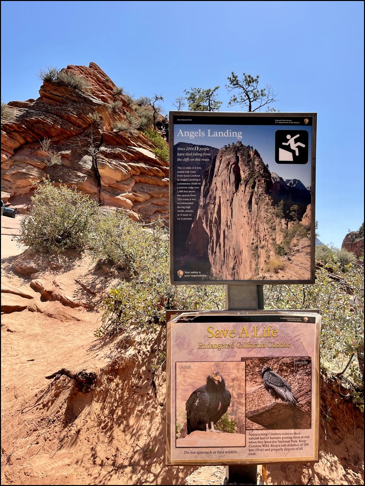 在Scout观景点West Rim和Angels Landing步道分叉,继续向前去Angels Landing,左转去West Rim步道。很多游客到这里就不再向上爬了。这里有一个路标,警示牌。