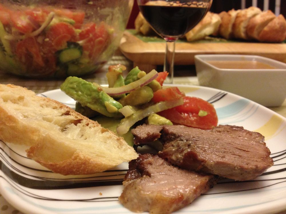 6, 羊肉切片, 酱汁装碟, 配蔬菜沙拉和法棍面包, 开饭啦!