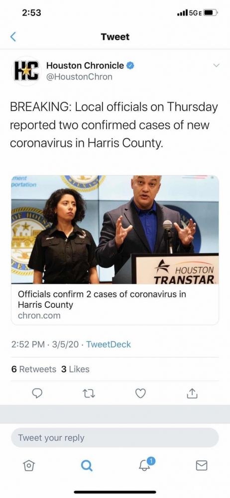 3月5号,新增两例确诊。意料之中。刚才,跑群一个在RICE 大学做教授的朋友透露了一些细节。新增的病例一个是大学员工,一个是家属,就是夫妻齐齐中招,这个神同步……证实了两人就是之前大家忧心忡忡的那个埃及团的成员。返回休斯顿有症状,确诊。朋友转发给我校方的邮件,意思是密切接触的16人在隔离。学校的危险程度依然很低。这样看来,虽然这个被誉为南方小哈佛的本州最好的大学不幸被击中,但校方已经尽了最大的努力让疫情控制在最小的范围内。学校并没有因此停课。措施到位,有条不紊,这就是美国节奏吧。