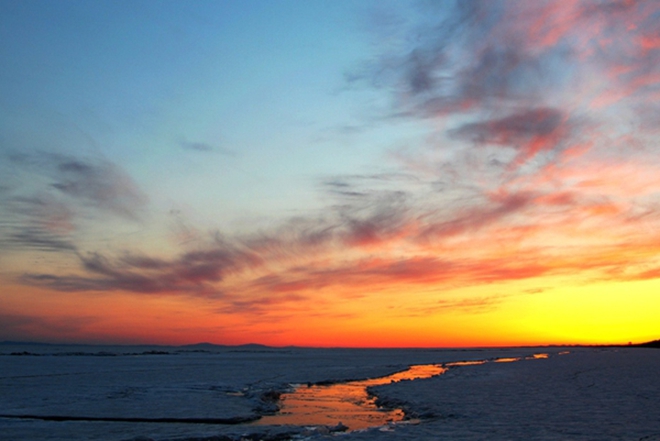 清晨,水天相交的湖面上泛出淡淡的霞光,随之光线越来越强,那火一样红的太阳慢慢地探出头来,升起、升起,直到完全跳出水面。生活在兴凯湖的人受到大自然更多的恩赐,不像很多游者为了看日出要跑到很远的地方。我不会忘记这样的情景:多少次,我们一行众人走在上工的路上,看到那火红的太阳从天边升起,不知从谁开始,唱起了《祖国颂》中“太阳跳出了东海,大地一片光彩,河流停止了咆哮,山岳敞开了胸怀……”的优美诗句,或《国际歌》中“鲜红的太阳照遍全球!”的铿锵旋律,紧接着,这歌声变为所有人加入的多声部合唱。……。那就是当年的我们,那时我们是那样青春年少,那时我们是那样激情满怀。