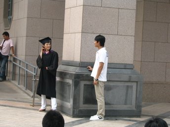 另一幕开始了。场景移在纪念堂的转角处。男女主角登场,女主角身着学士服,花一样的脸庞,长发,长腿,男主角白T恤,土色裤,球鞋。从造形上看,一个是城市女生,一个是农家学生。男生在反光板和摄影灯围着的过道里,迎着摄像机大步走去,女生快步赶了上来,喊着名子,说着什么,如此情景,在停和开始声中,足足走了七八次,方听导演喊了声过。
