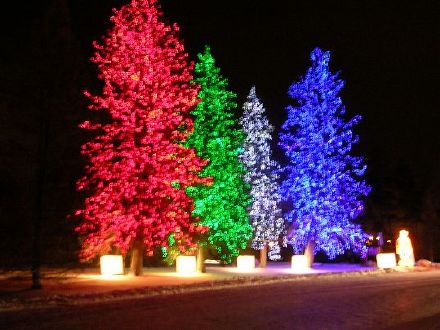 车排起了长龙,只见一加长林肯,像船一样在雪海中飘荡,另有一翻情趣。行进中,忽见前面异彩纷呈,绚丽无比,近处一看,四棵高大的塔松,从顶到下,分别用红,绿,白,蓝四种彩灯,装饰而成。红的像挂满累累硕果,娇艳欲滴;绿的闪闪烁烁,清莹如玉;白的皎皎如雪,如茉莉花开;蓝的像宝石镶嵌,华贵富丽。很难想象,这般清冷的雪夜,人们以无比丰富的思维,巧夺天工的手,绘制出能歌能舞,如此光鲜,如此动人的彩灯,让人激动万分地度过了这难忘的圣诞之夜。