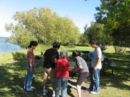 小妹一家新到这里,小晴也从渥太华来看望小姨。想不到一大家人会在这里相聚,共度中秋,真是月圆.人园.心园。中秋这两天,天气很好,天高云淡,不冷不热,呆在家里一起包饺子,又累又乏味。再说前两天刚吃过饺子,想来想去,都说去“BLACKSTRAP PROV PARK”野炊去。随即带了些鸡翅,鸡腿,牛排,红薯,土豆,饮料等,就上路了。