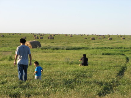 公园离市区约50公里,半个小时的路程。离开城区,沿11号高速南行,公路两侧,一丛丛树林,一汪汪如镜子般的湖水从眼前划过;刚收割完的麦田,在阳光照射下,金光闪闪;一卷卷麦草,整齐的摆放在地里,形成当地一道独特的风景,这些麦草是牲畜度过漫漫长冬的主要饲料。还有像恐龙骨架一样的喷灌机横跨在金黄色的田野里。大地是那样的辽阔,无遮无拦,一眼就看到了天尽头。我们正风驰电掣般的向神秘的天边驶去。