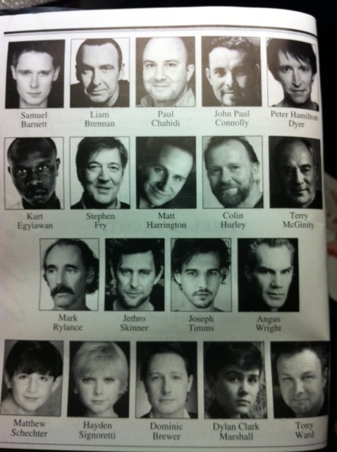 演员照片: 第三排第一位Mark Rylance反串女角Olivia,他同时在莎士比亚的悲剧“理查德王三世”中出演主角。第一张照片中的两个头像均是他表演的两个角色。