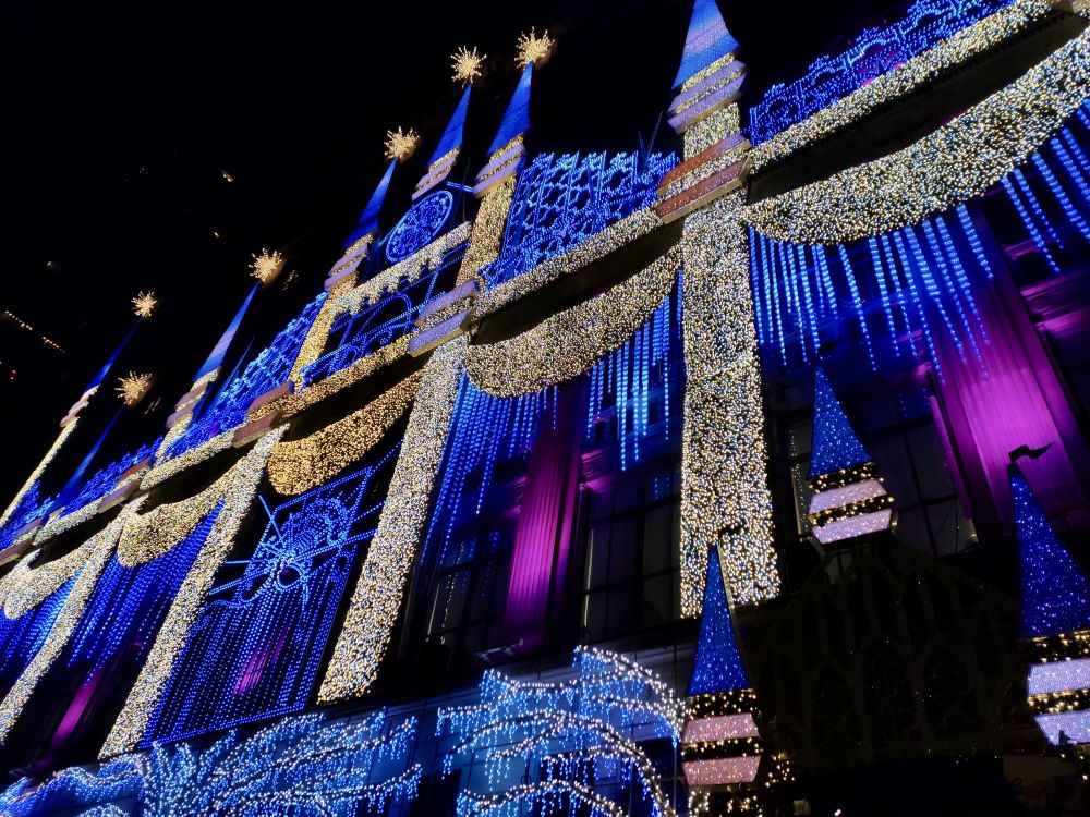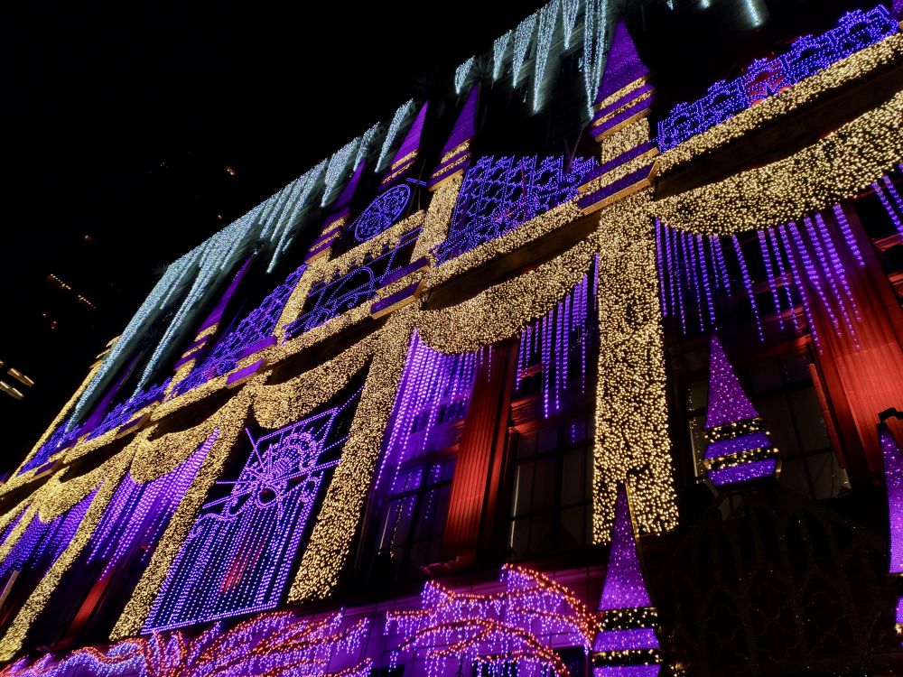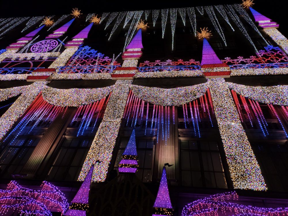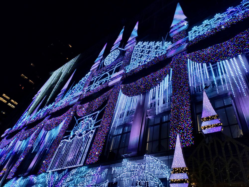 今年的 Saks Fifth Avenue 大楼的灯光装饰,图案和去年一样,但灯光颜色变换比去年要更丰富多彩,在震耳的节日交响乐伴奏下,灯光秀令人炫目。我有拍视频,但在此无法上传,可惜。