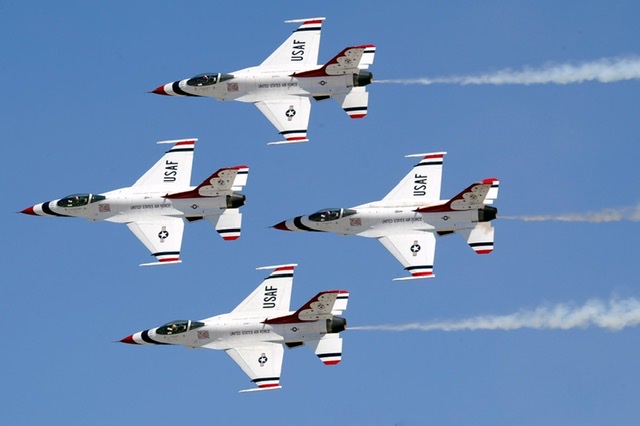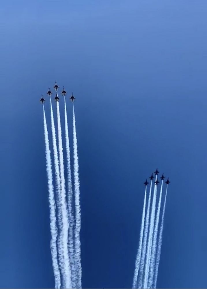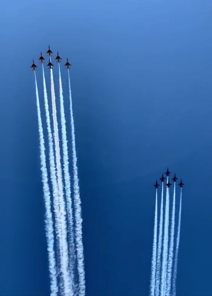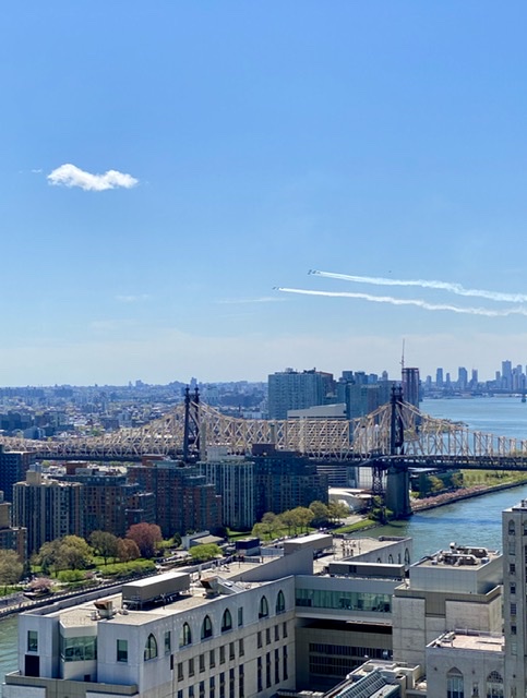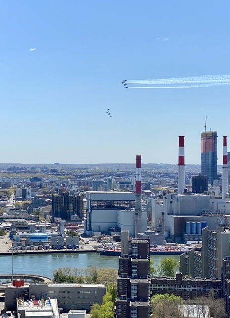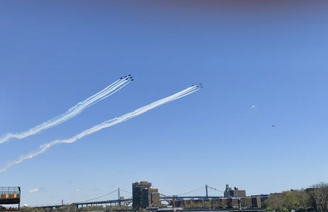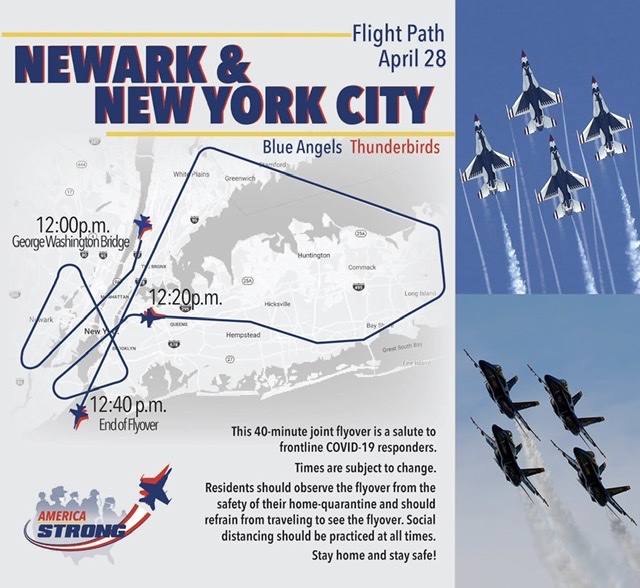 今天 Blue Angles Thunderbirds 的十二架战机组成两队,在中午十二点从曼哈顿西面的乔治华盛顿大桥附近起飞,飞跃 Newark、New York、长岛,继而飞往新泽西州首府 Trenton 和费城,向冠状病毒大流行前线的医务工作者和其他第一线工作者致敬。