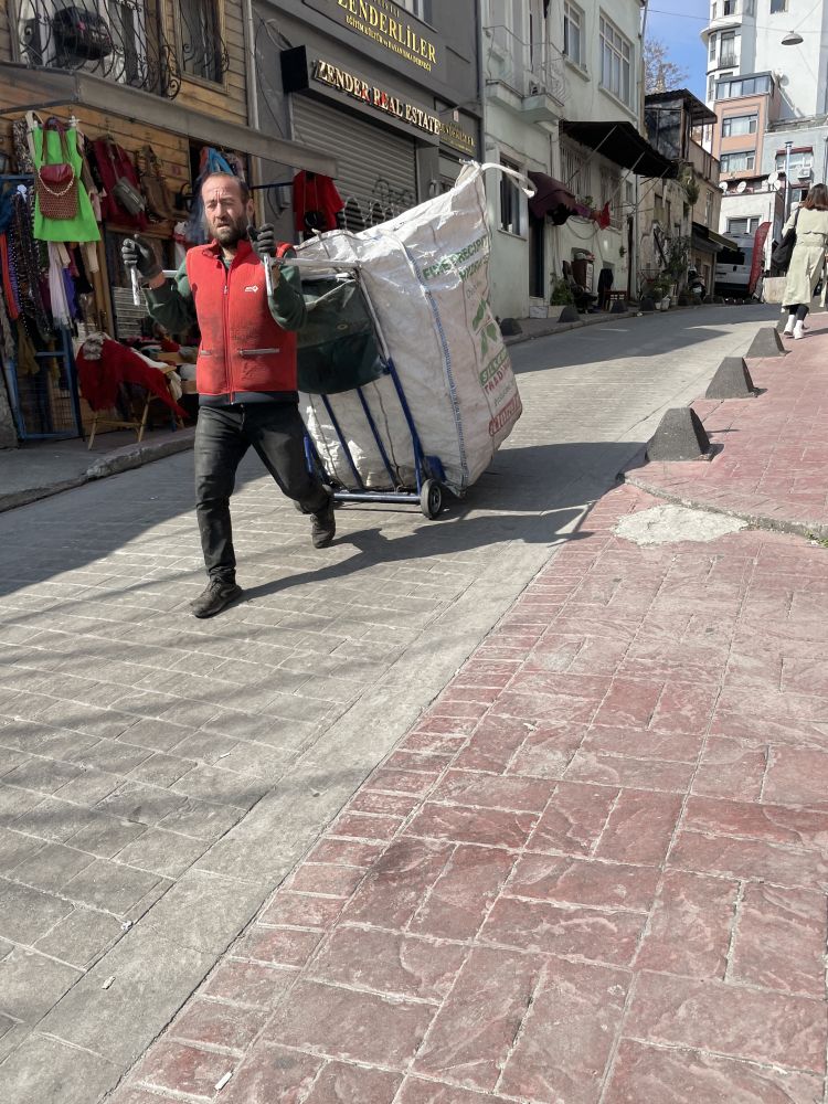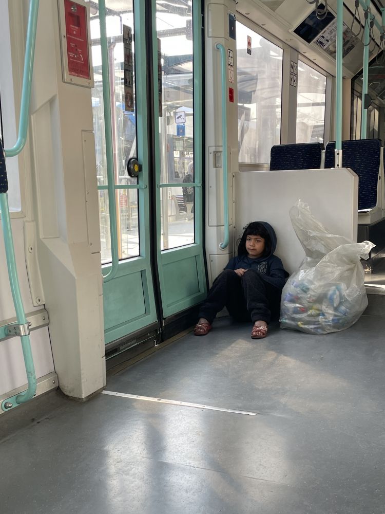 那天坐有轨电车去纯真博物馆,车上上来了两个女孩,都是衣衫褴褛,一个还赤着双脚没有鞋。两个人拎着大大的塑料袋,里面是搜集的塑料瓶。有乘客大声斥责她们从塑料瓶里流出来的液体弄脏了车厢地面。图中这个女孩用自己的脚去擦印汁。我不知她们是难民还是当地穷人,因为不懂她们的语言。